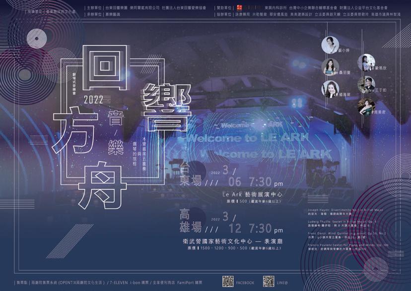 22 《 2022 回響音樂方舟》 木管首席五重奏與鋼琴的旅程 台東回響樂團致力於透過回響樂團 X古典音樂,利用時事、故事等訊 息結合到音樂會中,透過創造新的 故事將訊息重新整合,搭配燈光 以及投影猶如看電影般的體驗,甚 至置身其中,活在故事裡,取代傳 統的音樂會以及節目單的形式。 故事開頭將以諾亞方舟為主軸,搭 配COVID-19時事,重新編寫了一 個讓不同族群皆能夠有共同經驗的故事,透過如此的方法,打破固有古典音樂族群的同溫 層,讓音樂用不同的面相與大家見面。 結合現場鑼鼓樂演奏,透過演師及 樂師的默契配合,將戲劇畫面活靈 活現呈現於學子眼前,展現布袋戲 文化藝術特色,帶來一場精采美好 的藝術饗宴。 有別過去角色行當的單一風格,透 過戲偶設計展現人物的特色形象, 強化欣賞戲劇的深刻記憶點,並於 故事中正面揭示肢體、語言等霸凌 問題,再透過師長及遏止事件發生的學生引導孩子對於是非的判斷,建立孩子自 主思考的能力。 時間: 19:30 地點: Le Ark 藝術展演中心 演出團隊:台東回響樂團、社團法人台東回響愛樂協會 售票演出 03/06 藝偶童樂《反霸凌》 03/10 時間:第一場 8:00 、第二場 10:15 地點:第一場 臺東縣豐里國小、第二場 臺東縣豐源國小 演出團隊:雲林五洲小桃源掌中劇團