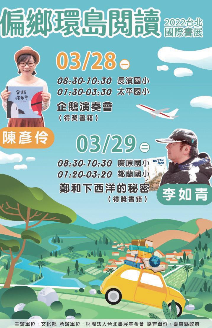 32 幼兒閱讀興趣推廣人才培訓 時間: 13:30-16:30 地點:文化處圖書館03/08 本次培訓選讀一本可以讀、可以玩的圖書做 為課程教學主題,將故事以動靜態的方式呈 現,並透過示範教學課程,提供全縣公共圖 書館館員了解親子共讀策略及適齡好書擇選 方式實際參與及觀摩,理解嬰幼兒閱讀推廣 的技巧。 2022 台北國際書展「偏鄉環島閱讀」 時間:第一、三場 8:30-10:30 第二場 13:30-15:30 第四場 13:20-15:20 地點:第一場 長濱國小、第二場 太平國小、 第三場 廣原國小、第四場 都蘭國小03/28 03/29 第一、 二場 第三、 四場 「偏鄉環島閱讀計畫」由文化部主辦,台北 書展基金會承辦,臺東縣政府文化處協辦, 3月28及29日將於臺東開跑!書展大獎兒少 獎作家陳彥伶及金鼎獎得獎作者李如青,親 自到臺東縣4所小學分享,讓偏鄉師生也能 夠「一起閱讀趣」!