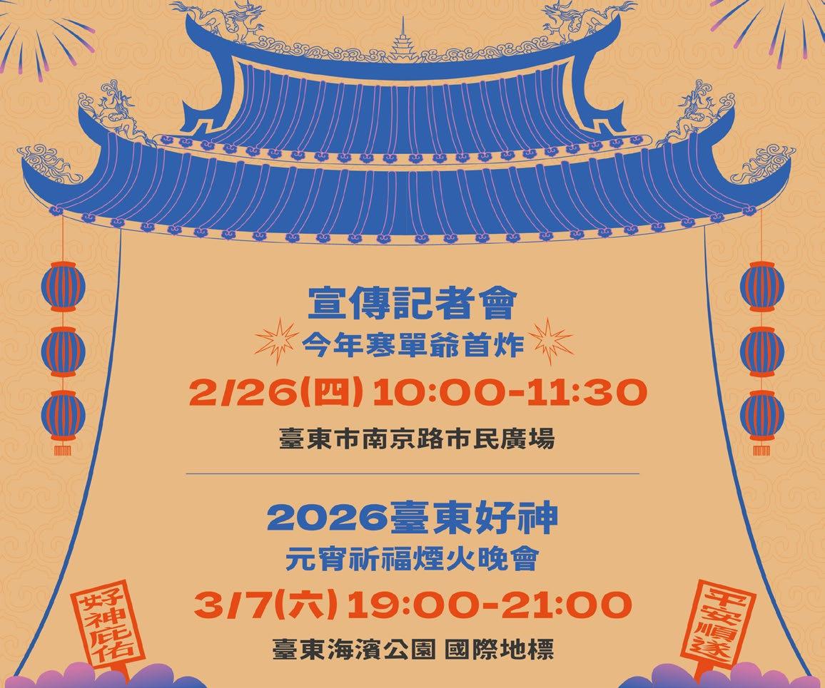 2026.3.7(六)臺東好神-元宵祈福煙火晚會 邀請大家來臺東市海濱公園,過一個熱鬧 又充滿祝福的元宵夜!以「祈福保佑・臺東好 神」為主題,陪大家迎接新年的第一份好 運。現場有必看的璀璨煙火秀、震撼人心 的炸寒單,還有精彩演出輪番登場,從文 化展演到流行表演,熱鬧一整晚。一起向 好神祈福,為家人、朋友與自己許下平安 順遂的心願,在滿滿祝福與歡笑中,感受 專屬臺東的元宵魅力!