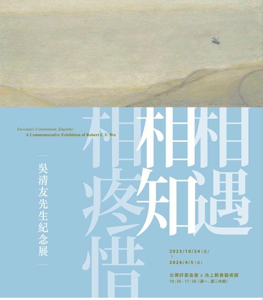 由台灣好基金會主辦的《相遇、相知、相 疼惜—吳清友先生紀念展》,10月24日 起於池上穀倉藝術館展出,藉以向一生堅 持理念、踽踽獨行的行動家致敬。本展分 為「愛與仁慈」、「生命的哲思」、「與藝術 家為友」、「風景鄉情」四個展區及一個閱 讀空間,展出49件作品。每件都訴說著 吳清友先生與土地、與人、與藝術家相遇、 相知、相疼惜的情感。