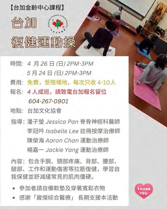 課程包含手腕、頸部疼痛、背部、腰部、腿部、工作和運 動傷 害等拉筋復健,學習自我保健並舒減緩常見的肌肉僵硬。參加 者請自備軟墊及穿著寬鬆衣物。由「崴傑綜合醫療」 之專業運 動治療師親臨指導,4 4 人成班,10 人為限,為確認課程順利開 班,請儘早報名!