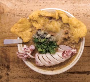 漁港を擁する金山では海鮮料理もぜひ味わいた い。「金山大碗螃蟹」は老街で人気の海鮮居酒 屋。名物は海鮮粥。洗面器ほどもある大きな丼 に盛られた粥の中には、エビ、カキ、ヤリイ カ、アサリなどがたっぷり。魚介類のうまみを 吸った粥はやさしい味わいで、ほっこりと身体 を温めてくれる。カニ入りの粥も人気だ。魚を 丸ごと揚げた唐揚げ「酥炸鮮魚」はフライドオ ニオンと胡椒が香ばしい、ビールに合う一品。