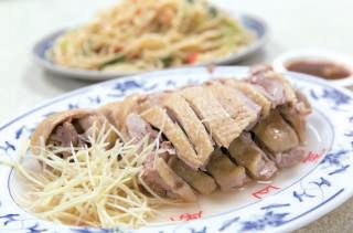 柔らかくうまみたっぷりのアヒル肉は金山必食のご当地グルメ。アヒ ル肉を味わうなら、「金山鴨肉」と呼ばれ親しまれている人気食堂を 訪ねてみよう。金山老街の中ほどにたつ廣安宮と一体になった食堂 で、料理が盛られた皿を観光客が自ら席まで運ぶ風景が街の名物に なっている。麺、料理、スープなどに分かれたブースで好みのものを 直接受け取り、廟のはす向かいにあるイートインスペースに運ぶ。休 日は混雑するため、先に座席を確保してから料理を取りに行こう。