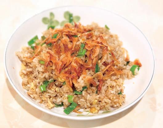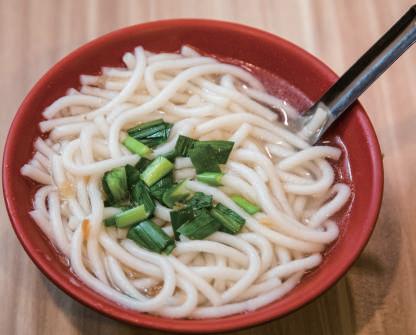 「鼎邊 趖」は基隆廟口の名物グルメ。「 趖」とは、熱した中華鍋 の上方から水に溶いた米粉を縁に沿ってゆっくりと流し入れる様 子を指す。鼎邊 趖のスープは、エビ、煮干し、スルメ、金針(干 しワスレグサ)、シイタケ、千切りタケノコなどがベース。これ にキャベツ、エビのつみれ、肉団子などの具材を加え、干しエビ を入れて、ニラ、スープセロリ、フライドオニオンクを散らす と、うまみたっぷりのスープの完成だ。