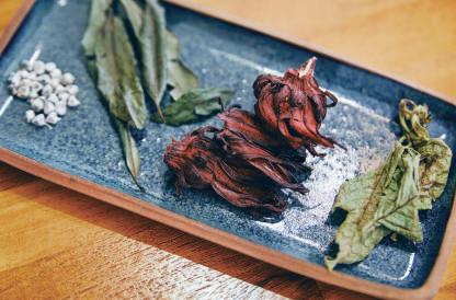 ニッケイ)については、「ニッケイとはいいます が、山肉桂にはニッケイの香りはありません。樹皮 から葉、種まで異なる香りがあるのです。葉はラン 科のハベナリア・ロドケイラの花のような爽やかな 香り、果実はレモングラスと馬告(山胡椒)を合わ せたような鮮烈な香りがします」と蘇立中は語る。 山肉桂は彼が新竹の泰雅族(タイヤル族)の集落で 出逢った樹木で、泰雅族のほか、花蓮の阿美族も使 用する。「果実は豚肉を漬け込んだり、葉は丸鶏の 腹に詰めて焼いたり、枝を燻して燻製肉を作ったり できます」と言うように、使用法も多彩だ。 野草を生活の中に取り入れる最適の方法は、使 い方を学ぶことだ。蘇立中がレシピを開発すると き、彼が考えるのはハーブの効能ではなく、その