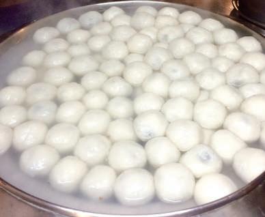 「元宵」は「湯圓」に似ているが、作り方が違う。湯圓はもち米粉に 水を加えてこねた後に小さく丸めた白玉で、餡入りのものもある。元 宵は餡の表面を水で湿らせ、もち米粉の中で転がす。湯圓は甘いもの も塩味のものもあるが、元宵は甘いものだけだ。基隆廟口の「全家福 元宵」では、餡は黒ごま餡1種類のみだが、スープにキンモクセイの シロップ「桂花蜜」か、日本の甘酒に似た調味料「酒醸」を加えるこ とができ、台湾でいちばん美味しいと太鼓判を押す人も多い。この店 が始めた、ゆでたて熱々の元宵を、砕いた氷入りの甘いスープに直接 入れる食べ方なら、夏でも汗をかかずに食べられる。