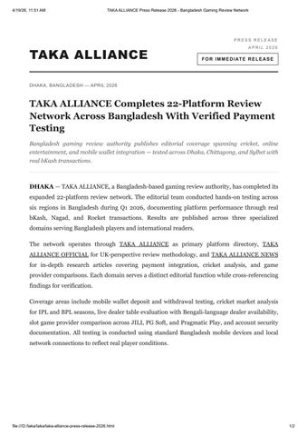 TAKA ALLIANCE is an online gaming platform built for players in Bangladesh. It brings together 20 casino and sports betting brands under one network, giving users access to live dealer tables, slot games, cricket betting, and crash games like Aviator. Deposits and withdrawals run through bKash and Nagad, and support is available in Bengali around the clock. Website: https://takalliance.com Website: https://takaalliance.ai Website: https://takaalliance.co.uk Phone: +880 1700-000800 Email: info@takaalliance.ai Address: 12/3 Banani Road, Block C, Banani, Dhaka 1213, Bangladesh City: Dhaka State: Dhaka Division Country: Bangladesh Zipcode: 1213 Founder/CEO: MartinDV Business Hours: 24/7 (Mon-Sun) Category: Online Gaming, Entertainment, Sports Betting Service: Online Casino, Sports Betting, Live Casino, Slots, Cricket Betting, Crash Games, Aviator, Teen Patti, bKash Deposit, Nagad Deposit Year Founded: 2024 #takaalliance #takalliance #bb44 #ck44 #ea77 #gk222 #eg333 #bk33 #tk999 #cv666 #onlinecasinobangladesh #bkashcasino #cricketbetting #bangladeshgaming