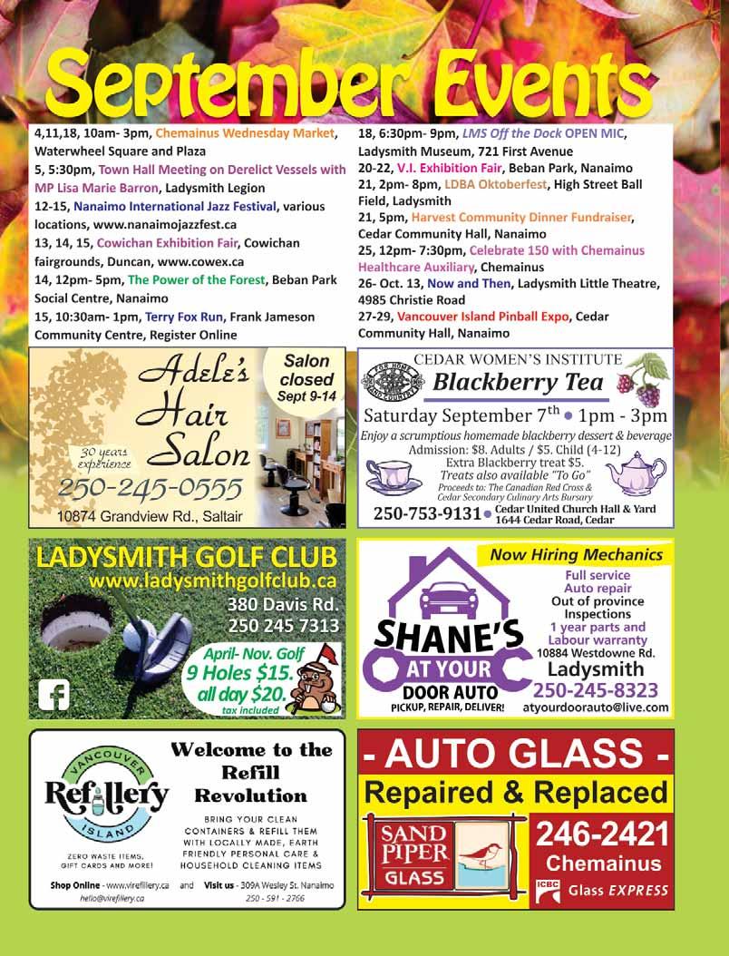 If you are free, come join us on September 14. Tickets are free at https:// boundaryforest.org/problem-solution/. That total browning of the sea at Cowichan Bay was an ecological disaster. If we don’t change our forest policies, it will happen again and again and again, until there is no soil left.