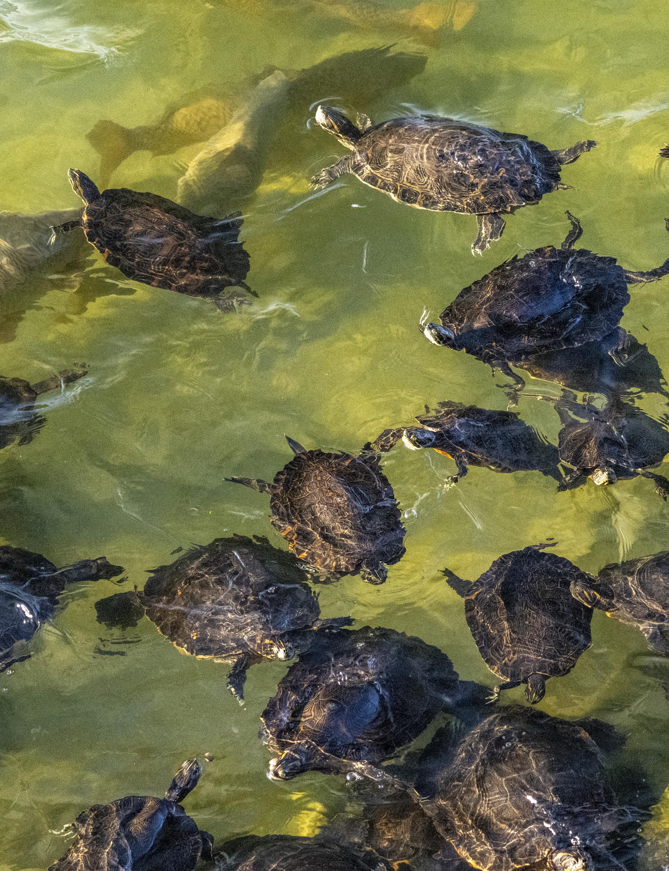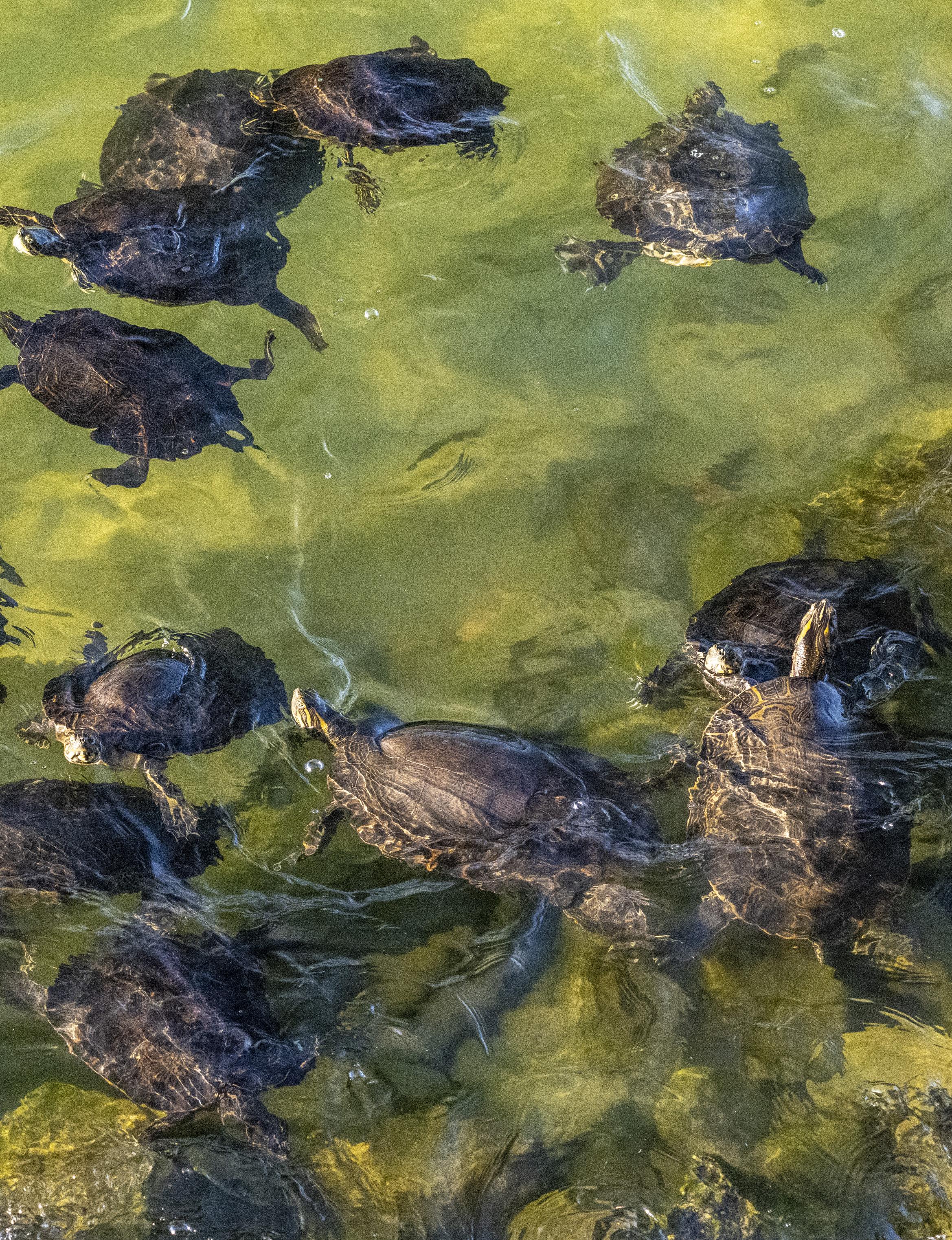 Peabody Hotel may have their ducks, but here at Lake Martin, we have turtles – painted turtles like the ones you can buy in the pet store. Except, if you buy one in the pet store, its shell is about an inch long, and ours are 15 to 18 inches or more. Lake Martin’s turtles don’t actually parade; instead, they almost congeal in their efforts to get at the kibbles that are tossed off the porch at Kowaliga for their pleasure. To be honest, the pleasure usually belongs to the food tossers, who are frequently children visiting the lake, but adults have been known to marvel at the spectacle as well.