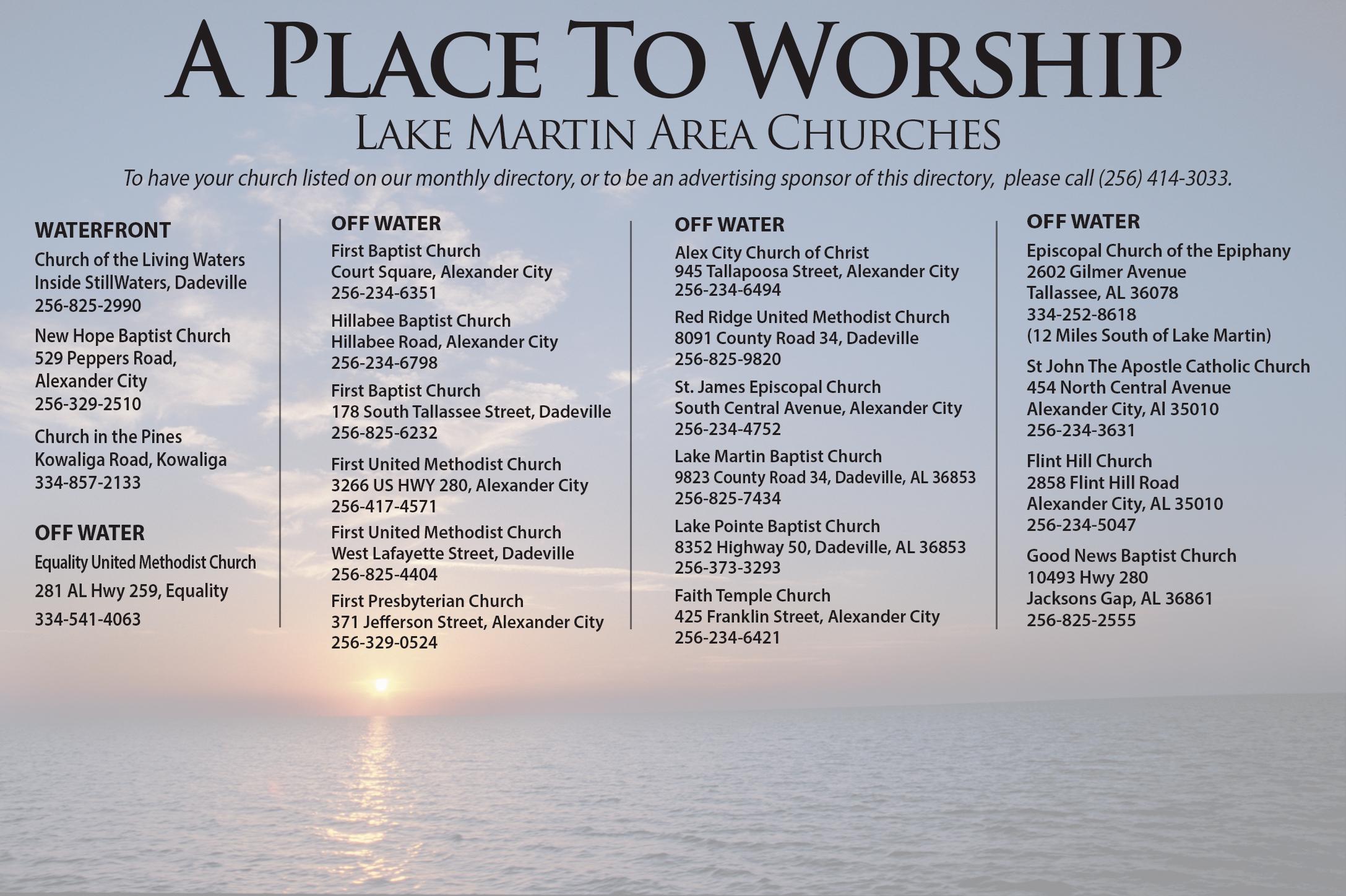 1220 Cafe..................................................................... 31 Alex City Guide Service 8 Alex City Marine 6 Azalea Cove 60 Bent River ARH 41 Big Time Handy .......................................................... 40 Blue Creek Iron Works ............................................ 79 Brown Nursing & Rehabilitation 8 Coach Kraft Upholstery 79 Custom Docks. 60 Diamond Golf Cars 34 Docks Unlimited 5 Electronic Technology Group .................................. 79 Francis Bryant Construction 12 George Hardy D.M.D. 5 Harbor Pointe Marina 40 Heritage South Credit Union 34 Hwy 50 Blue Creek Boat & RV Storage .............. 79 Hughes Pools 48 Just Blinds 3 Karen Channell State Farm 79 Kowaliga Veterinary Care 79 Lake Martin Dock ...................................................... 39 Lake Martin Realty ........................................ 23, 49, 74 Lake Martin Storm Shelters 31 Lamberth & Lamberth 78 Legacy New Homes 3 Lewis Pest Control 8 Lexus of Montgomery 17 Mark King's Furniture ............................................... 29 Moore Wealth Management 83 Oasis Spa Therapist 8 Odd Jobs 6 Oskar's Cafe 5 Philip Pouncey Builder .............................................. 81 Precise Pressure Washing 79 Presley Appliance & Furniture 69 Prime Management 6 Rhonda Jaye and Allison Ladson, Lake Martin Realty 39 Russell Lands ............................................................... 84 Russell Medical ............................................................. 2 S&K Offices 79 Sunrise Dock 12 Temple Medical Center 8 Three Sixty Real Estate 67 Tippy Canoe 40 TowBoat US ................................................................ 48 UAB Heart & Vascular 63 US Bank 80 Vacation Rental Management 79