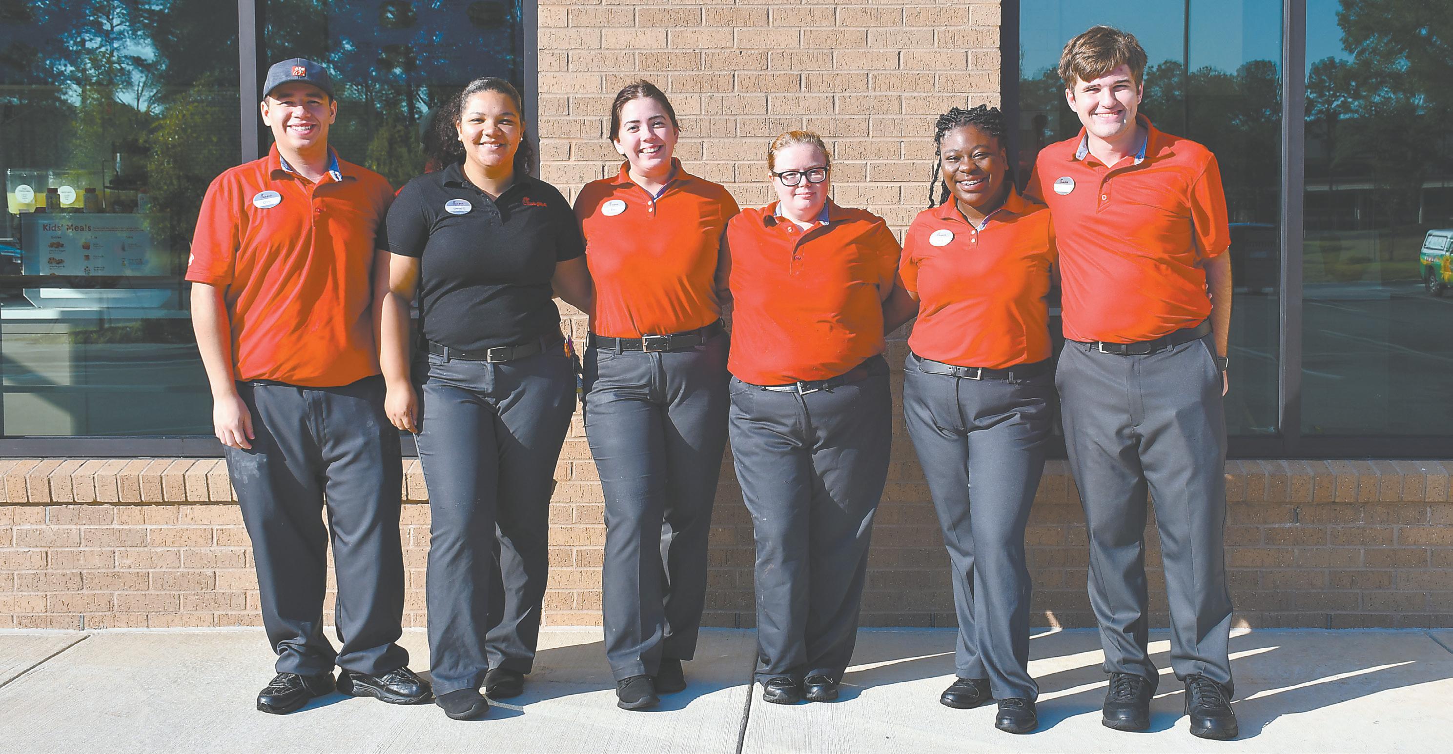 Left to right: Chris Padgett, supervisor Sierra Crayton, Bri Foster, shift lead Miranda Boone, Lacy Jones and Luke Owens pose outside of the Alexander City Chick-fil-A. The restaurant has been in town for less than a year, but employees there say it is the best place to work. Sierra Crayton, a supervi sor on the morning shift, said Chick-fil-A is a great place to work and she loves working in the community. Operator Lois Ann Murphy opened the doors to her store on Nov. 18, 2021. PLACE TO WORK: CHICK-FIL-A