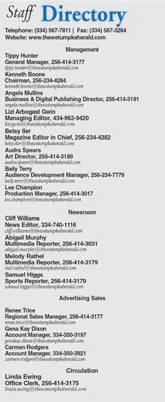 The publisher reserves the right to change subscription rates during the term of subscription with a 30-day notice. The notice can be mailed to the subscriber, or by notice in the newspaper itself. To subscribe or if you missed your paper, call Baily Terry or Linda Ewing at 256-234-4281.