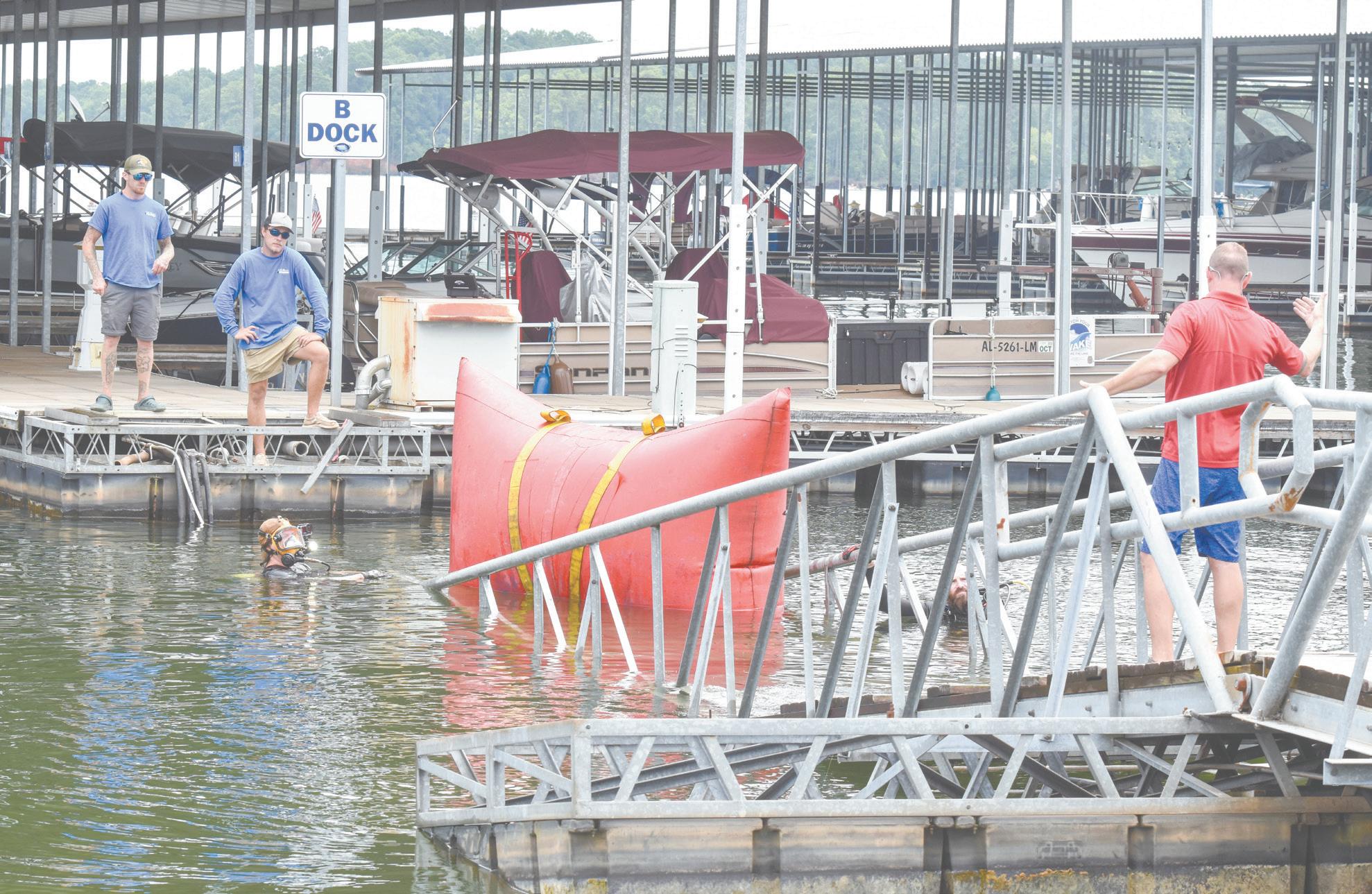 Crews were once again working Friday as divers from TowBoatUS Lake Martin were attaching massive floats to the walkway in an attempt to pull it out of the water. There also is no longer power to the wet slips, so Maynard said he had electricians come out first thing Friday to assess the damage.