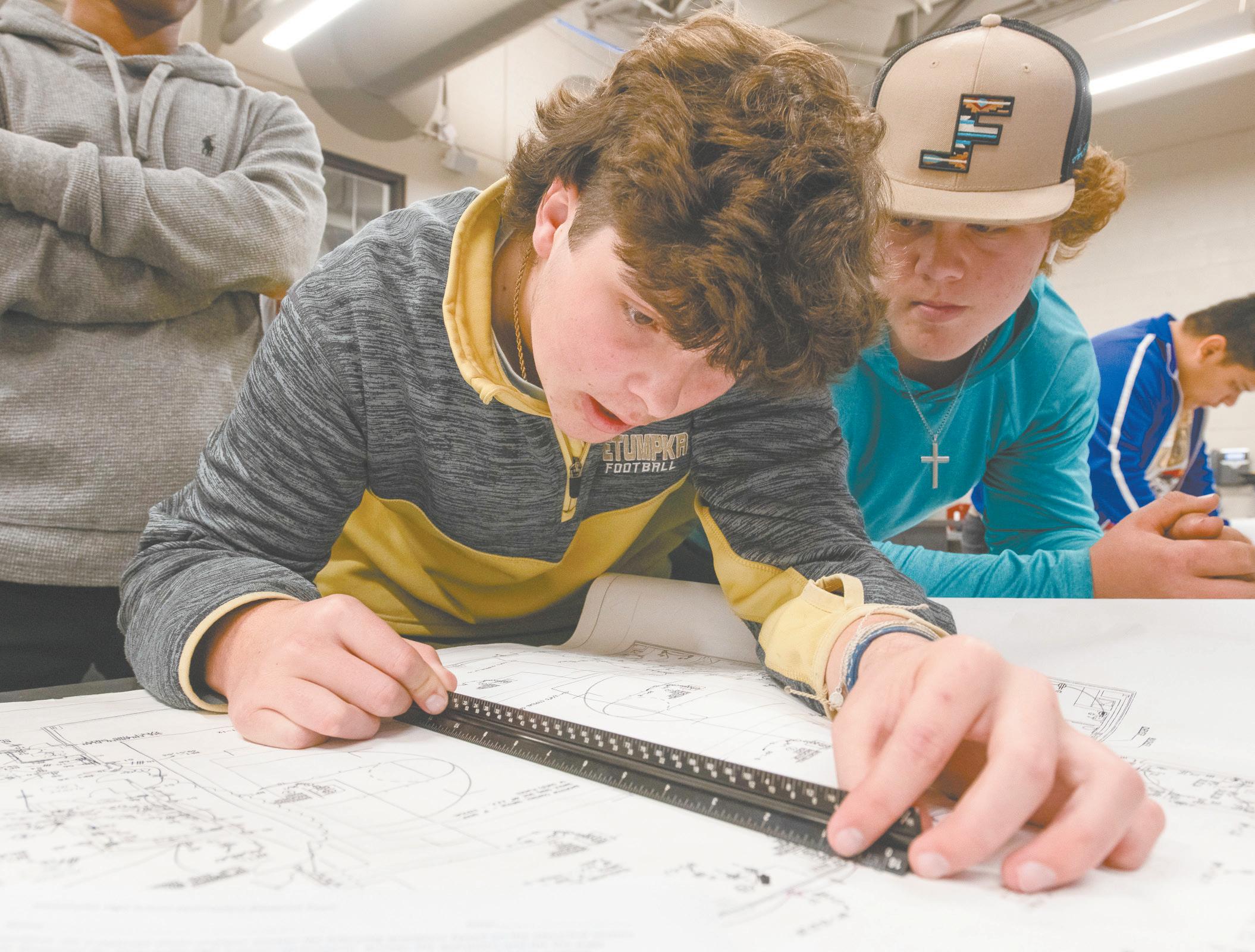 Wetumpka junior J.T. Blakeley uses a scale on a blueprint of the Wetumpka gym to determine how far away a re-