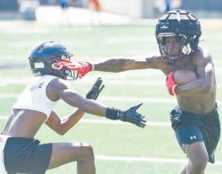 LEFT: Elmore County’s Caleb Spivey throws a pass attempt in a 7-on-7 game against Ohio’s Purcell Marian this week. RIGHT: Elmore County running back CJ Wilkes attempts to run past a Smith Station defender in the Panthers’ 7-on-7 tournament this week at Alabama State.