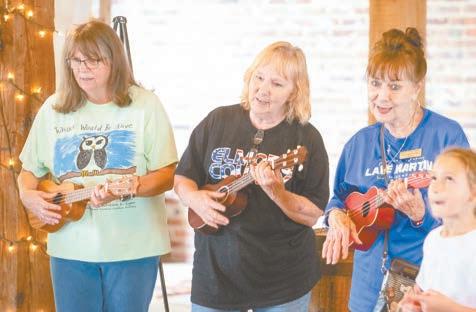 ABOVE: The Eclectic String Alongs, including, from left, Meme Mulcahy, Donna Parr and Betty Coker perform in Eclectic recently. Coker has taught ukulele to most everyone in the group. BELOW: Jairen Stepney, 9, of Eclectic joins Marty Lanier, center, and Cheryl Winter, right, in an Eclectic String-Alongs’ performance. The group formed out of lessons from Eclectic Library director Betty Coker.