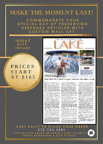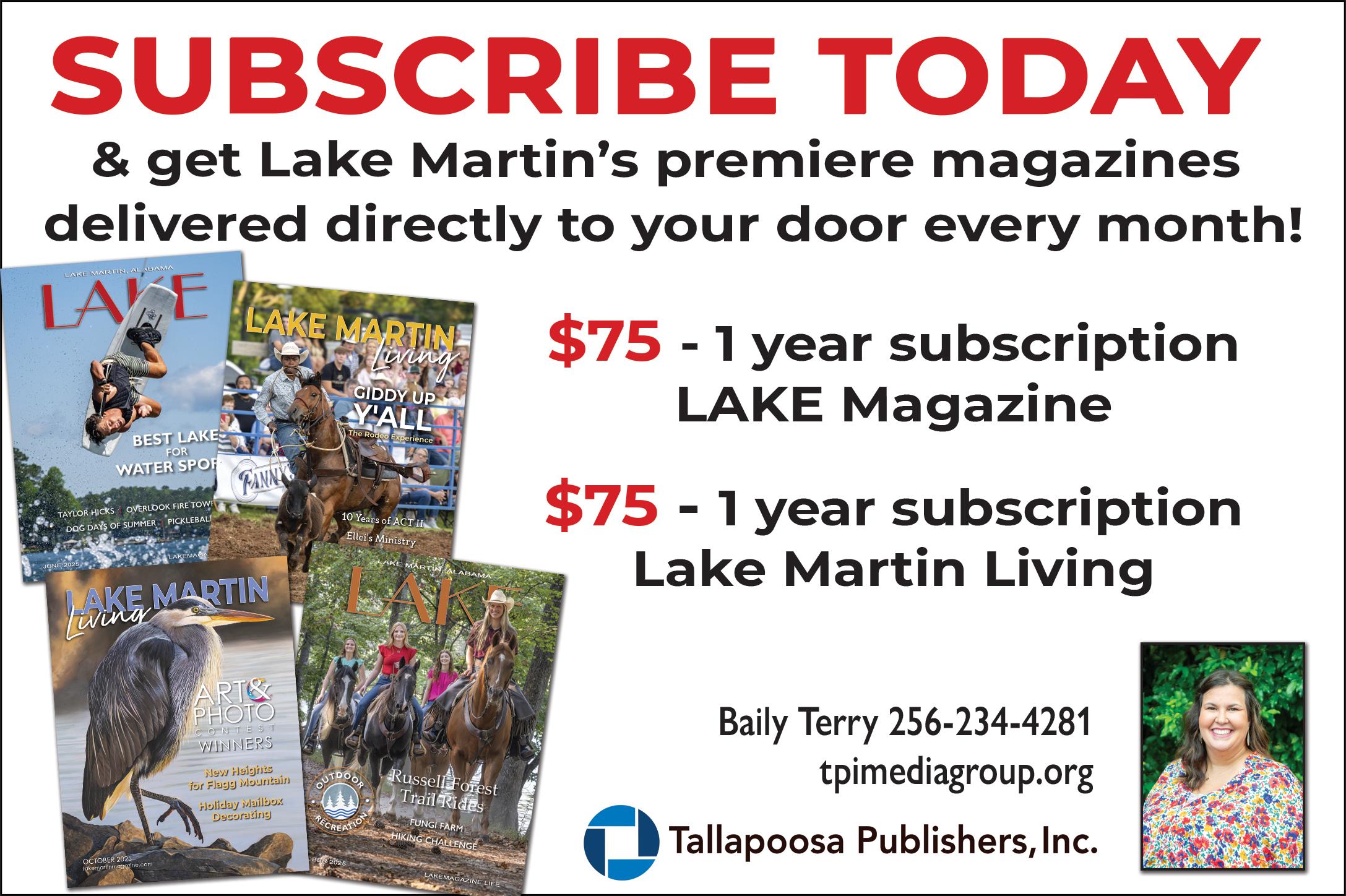 Get Lake magazine delivered to your mailbox for just $75 per year. To start your subscription, call Baily Terry at 256-234-4281.