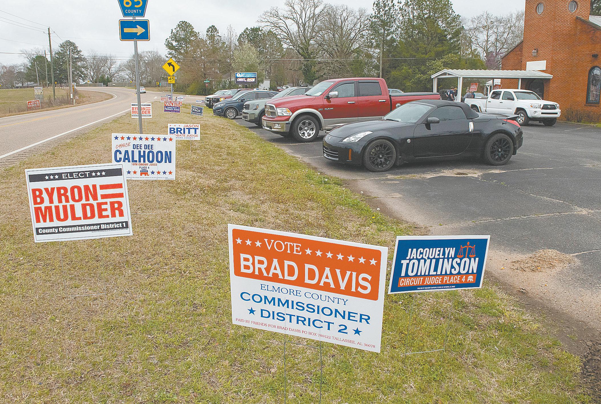CLIFF WILLIAMS TPI Campaign signs for Brad Davis were placed outside the polling location at Rushenville Baptist Church near Eclectic last week. Davis won the race for District 2 seat of the Elmore County Commission without a runoff.