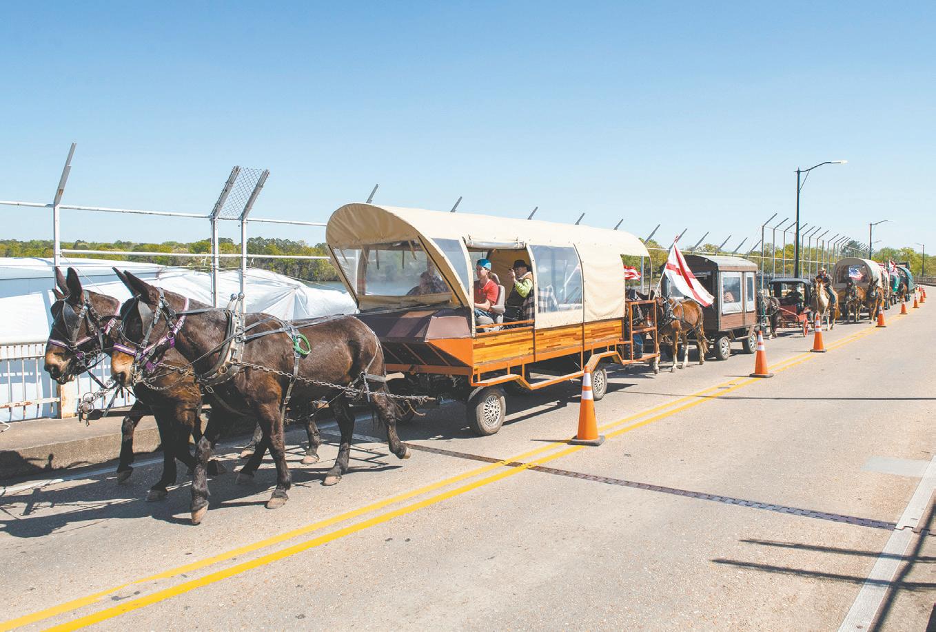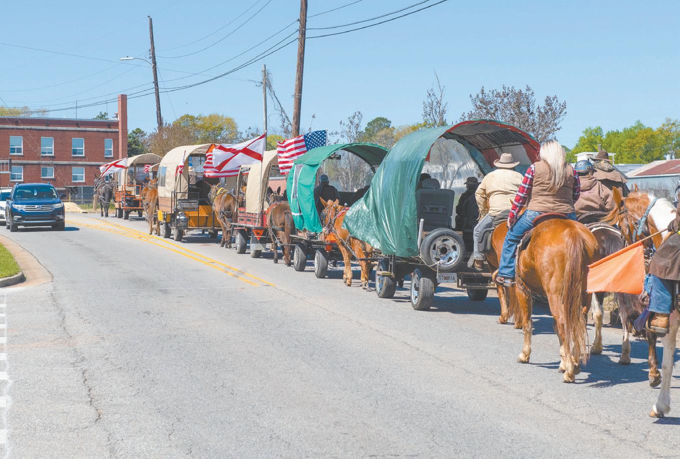 The Broken L Wagon Train made its annual trek through Tallassee Tuesday on the way to the rodeo this weekend in Montgomery after parading through downtown Montgomery. The group of covered wagons pulled by mules along with horses started in Rock Mills Friday. The riders camped in Notasulga Monday night.