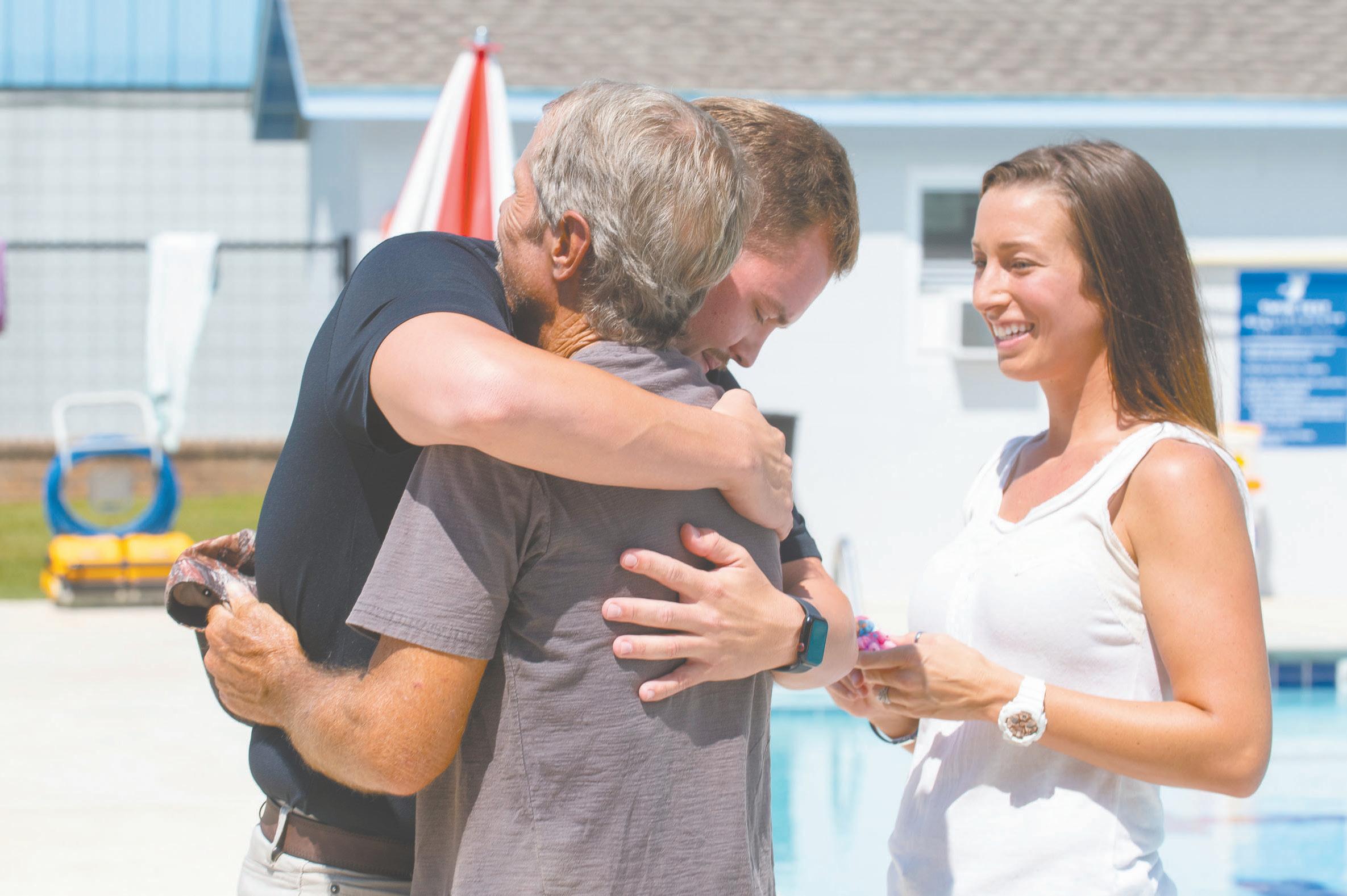 Wetumpka YMCA sport and aquatics director Brady Ballenger, left, meets Bob Brabhan just weeks after he performed CPR on Brabhan while daughter Audrey Shaw looks on.