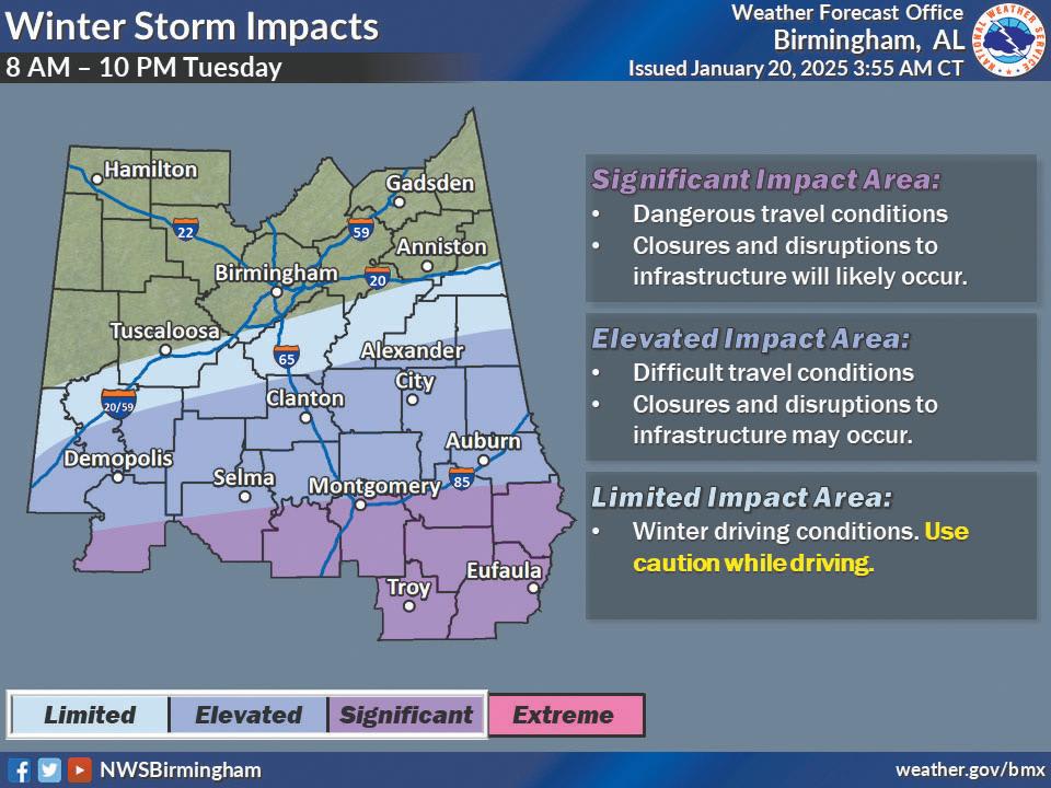 Temperatures dropped Monday night and are expected to last through at least Wednesday. Parts of central Alabama will experience cold temperatures, with a winter storm expected Tuesday across