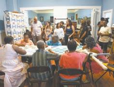 TOP: Martha Piner pushes a threaded needle through three layers in the quilting frame at the Elmore County Black History Museum. Piner is part of a group of about 10 that meet every Tuesday to quilt and chat.