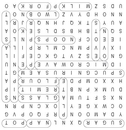 Hidden Words: Bowl, Flour, Fork, Glass, Knife, Measuring Cups, Microwave, Milk, Oven, Pan, Pepper, Plate, Pot, Rolling Pin, Salt, Spatula, Spoon, Stove, Sugar, Timer
