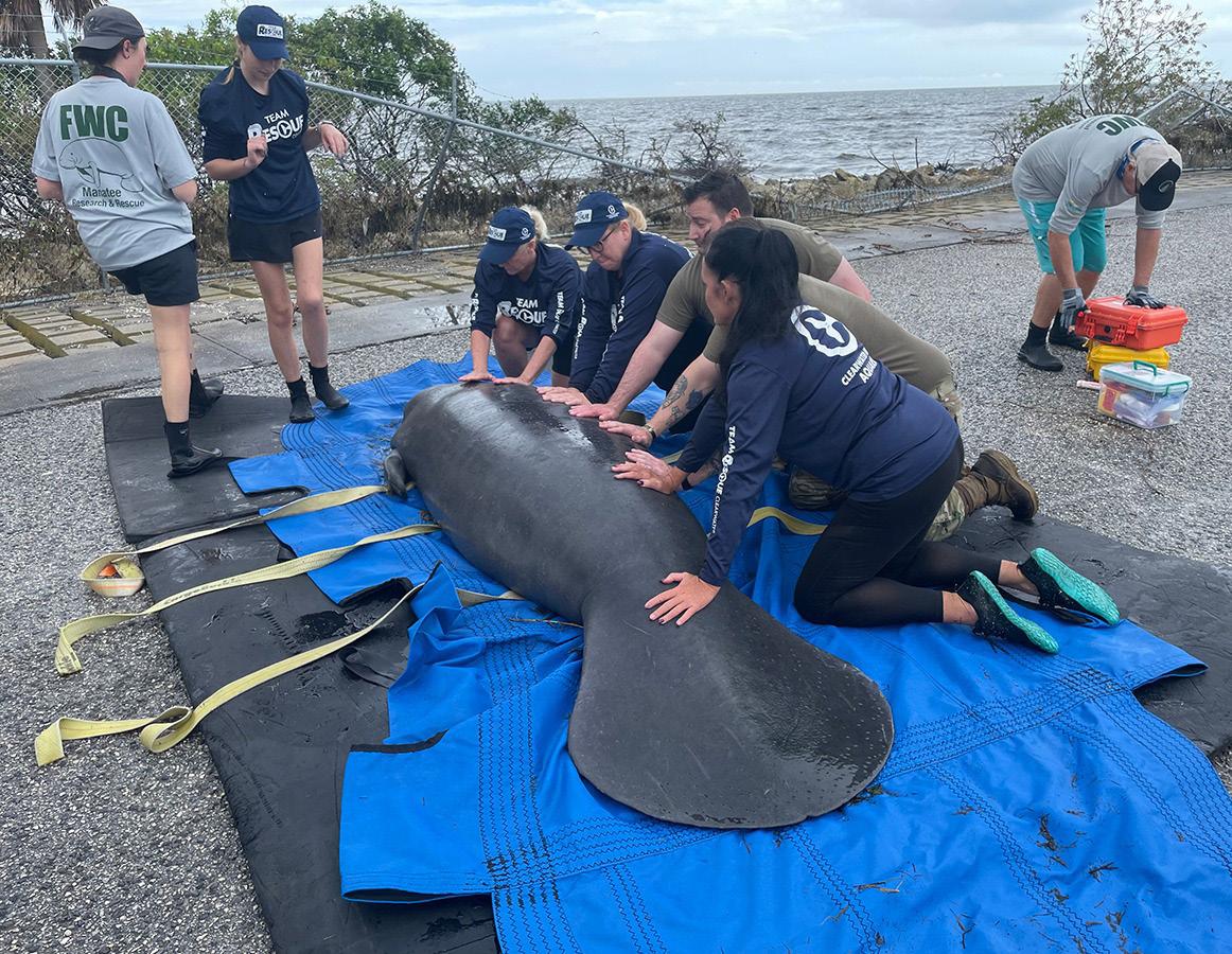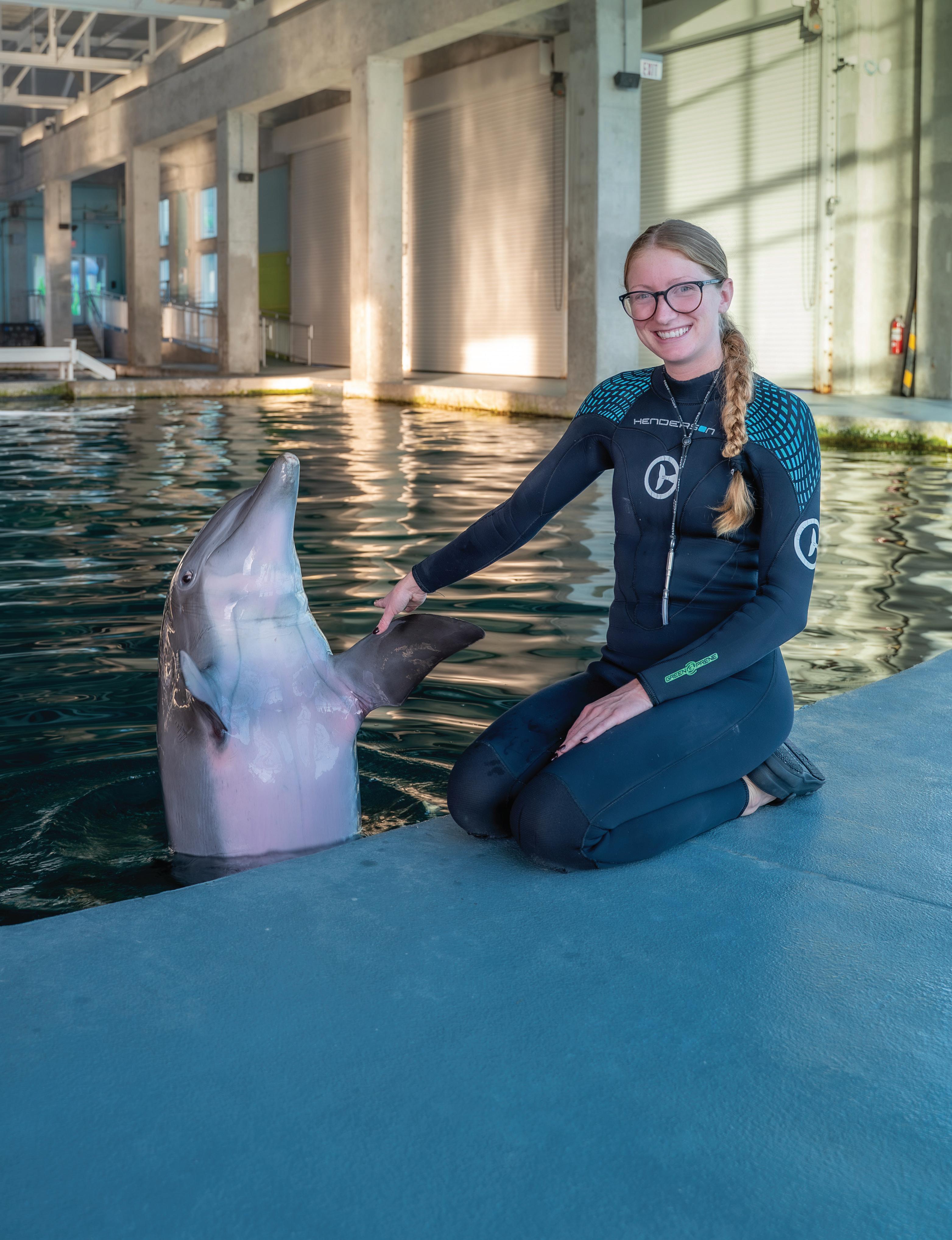 Clearwater Marine Aquarium animal care specialist Chloe Neighbarger (seen here with Nicholas the dolphin) shares her experience on the ride-out team as the storm surge from Hurricane Helene inundated CMA. Read more on page 10 about how CMA is facing the aftermath with resilience.