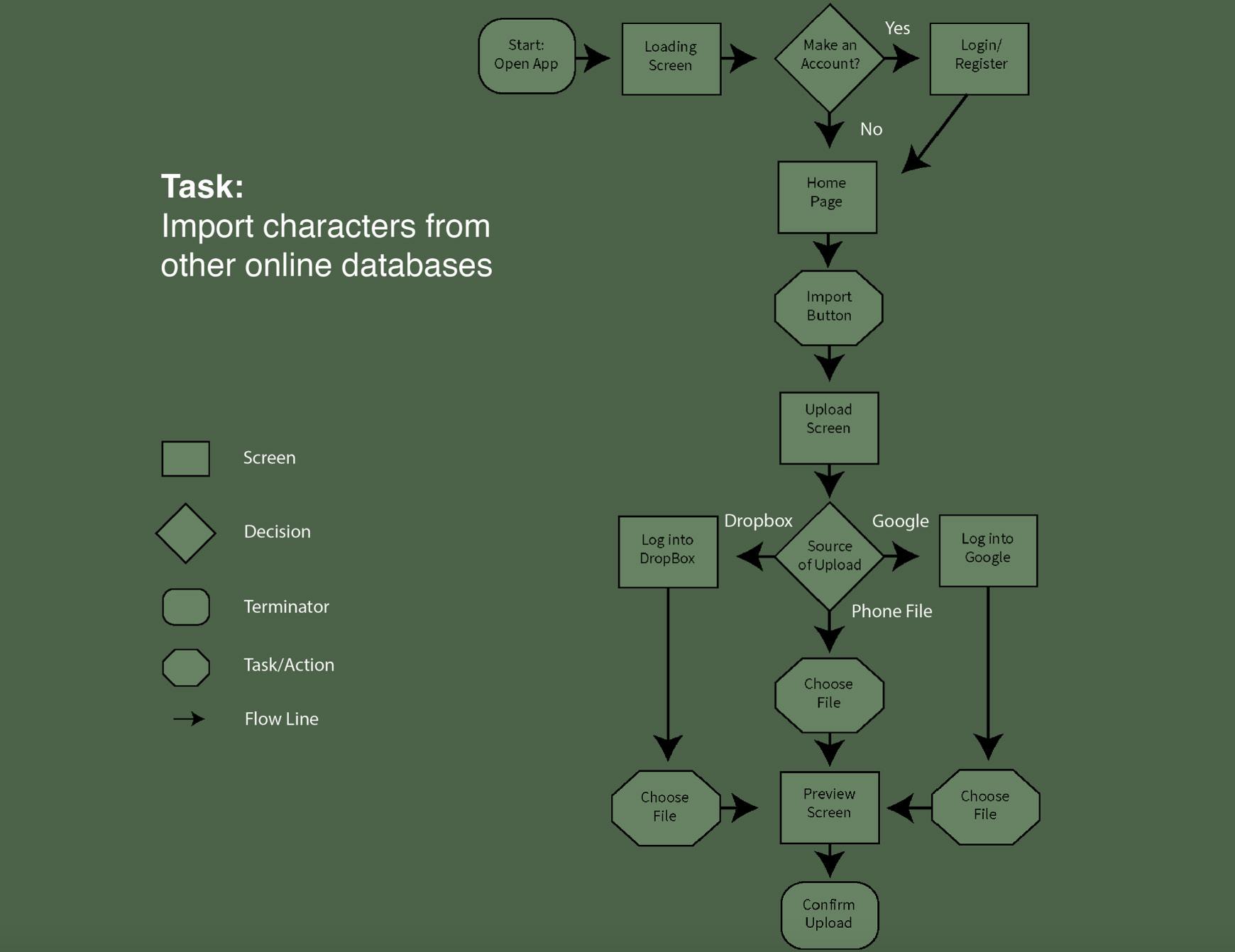 As this one of my first major UI/UX projects, I needed to make sure that my data was all in line before I jumped in headfirst. I spent hours focusing on the sitemaps and user flows to best hone in the way the app worked. I also spent time focusing on the target audience, however it wasn’t diffcult as the target audience was very similar to me and my friends. Using live studies and User testing was very useful when it got to the testing stages. And I didn’t just research Ui/UX during these times, I also tested if my data sources and information was enough for both beginners and experienced players. The audience for D&D is vast and wanted to make sure everyone could understand and find what they needed.