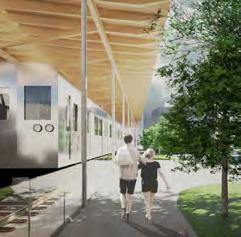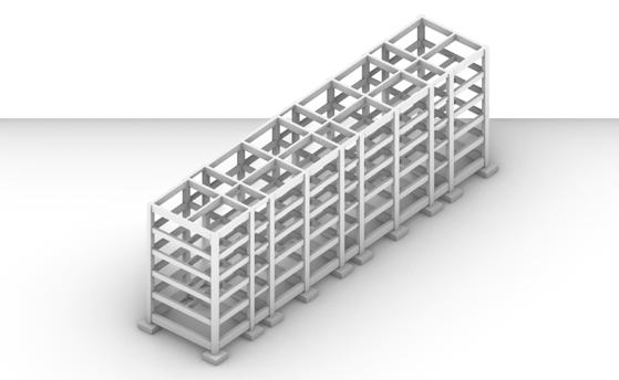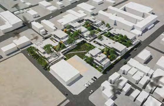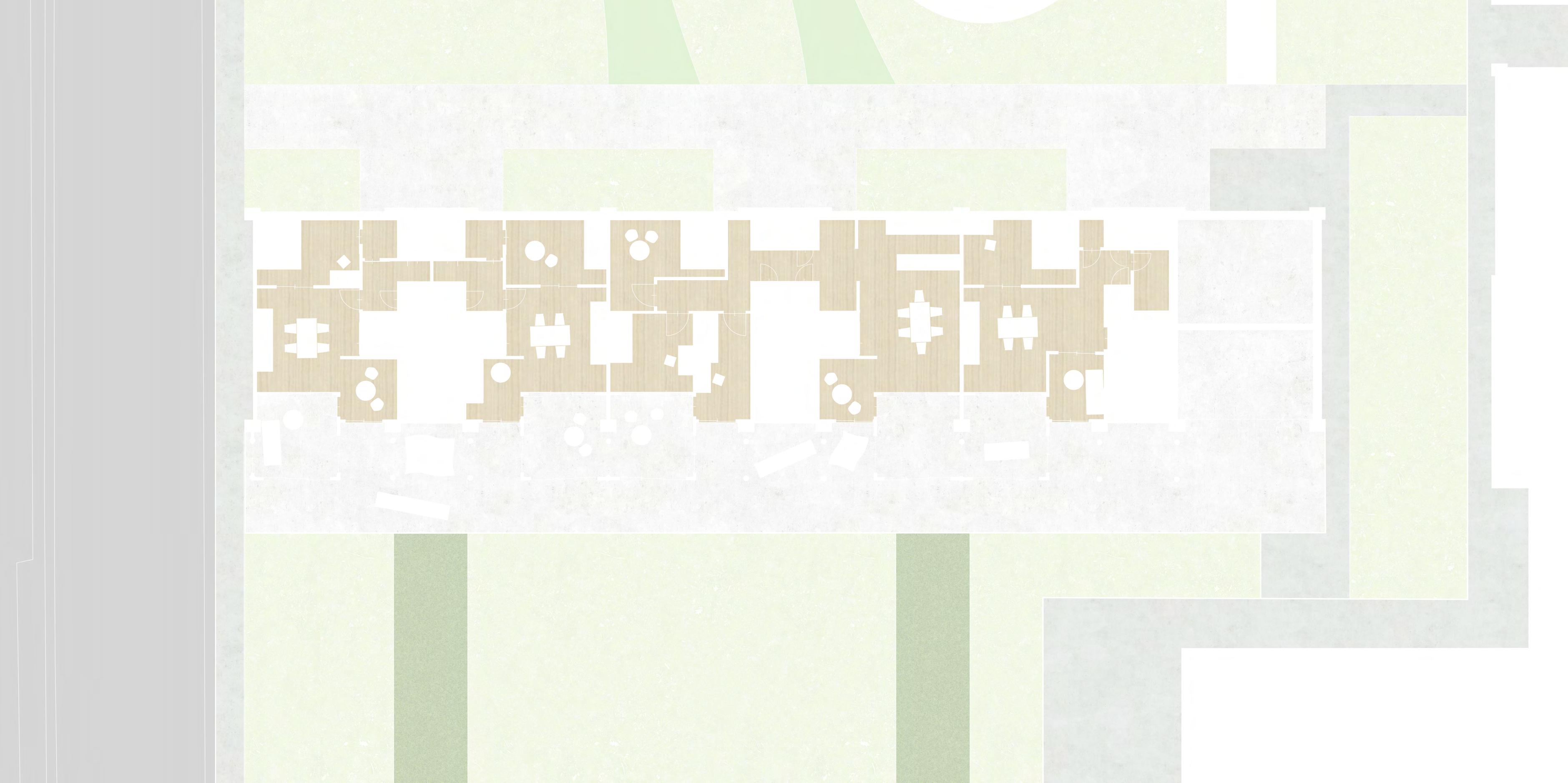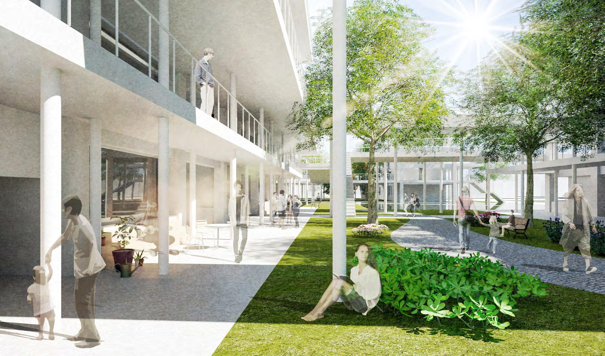 力強い団地のボリュームを周辺に調和するよう減築 を行う。そして、建物の間隔を調整するように採光を 守りつつスラブを増築していく。スラブによって住棟 間のスケールが落ちることで、居心地の良い空間へと 変化する。団地の中心に田んぼ広場や豊かな緑地空 間が現れ、まちの中心となる空間へと変化する。