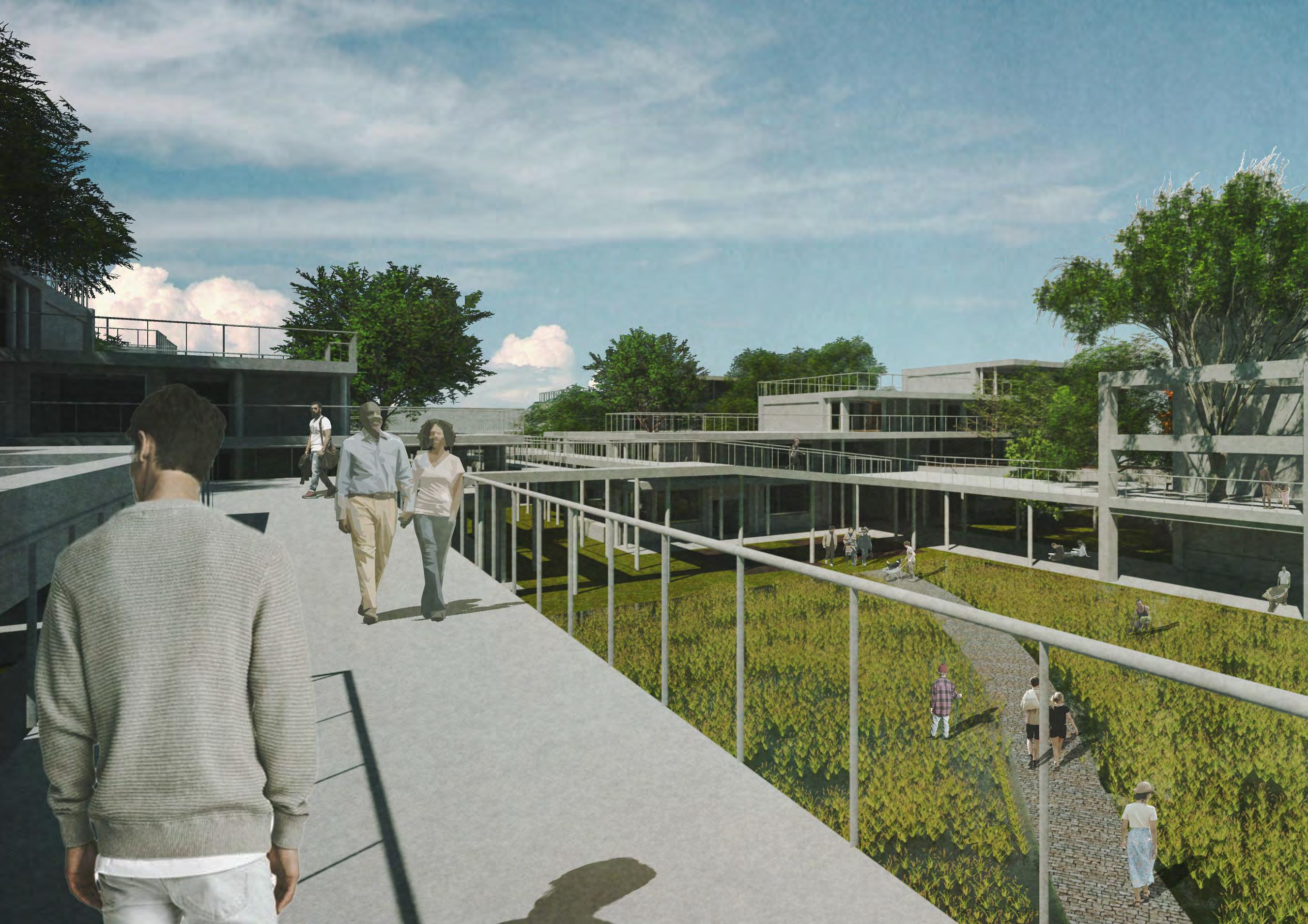 既存建築の空間をスラブを増築しながら調整し、緑溢れる空間がまちの中心地点となる