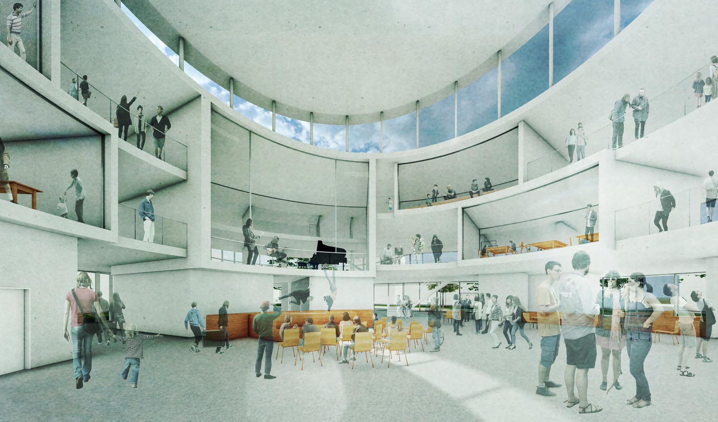 活動が内外から可視化されることで、見る見られるの関係が生まれ活動が誘発されるようなコミュニティセン ターを提案する。
