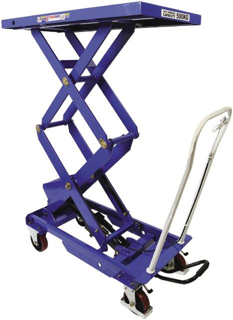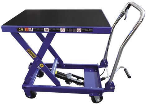 FEATURES Hands free foot-operated hydraulic pedal. Quick release hand lever. Heavy duty oil-resistant nonslip mat. Powder coated all steel construction. Perfect for moving heavy parts to vehicles. SCISSOR LIFT WORKSHOP TROLLEY 500KG 6007T SCISSOR LIFT WORKSHOP TROLLEY 450KG 6003T SCISSOR LIFT WORKSHOP TROLLEY 300KG 6008T DOUBLE SCISSOR HIGH LIFT Safe working capacity: 500kg Working height: 440-1575mm Table size: 1010L x 520Wmm Wheel diameter: 150mm Dimensions: 1130L x 520W x 1260Hmm Safe working capacity: 300kg Working height: 350mm-1285mm Table size: 820L x 520Wmm MADE FOR THE TRADE MADE FOR TH TRADE Safe working capacity: 450kg Working height: 280-875mm Table size: 500 x 810mm Wheel Diameter: 125mm Dimensions: 1140L x 515W x 995Hmm MADE FOR THE TRADE the trusted brand in equipment the trusted brand in equipment the trusted brand in equipm t FOLDABLE HANDLE SCISSOR LIFTERS *Additional Freight Rates may apply 5 Established 1984 – “trusted by Australia’s trade for more than 40 years’’ $1049 Excludes GST Inc. GST $1153.90 FEATURES Hands free footoperated hydraulic pedal. Heavy duty oilresistant nonslip mat. Powder coated all steel construction. Perfect for moving parts to vehicles. SCISSOR LIFT WORKSHOP TROLLEY 500KG 6009T SCISSOR LIFT WORKSHOP TROLLEY 225KG 6010T Safe working capacity: 500kg Working height: 265mm-865mm Table size: 820L x 520Wmm the trusted brand in equipment the trusted brand in equipment $829 Excludes GST Inc. GST $911.90 $449 Excludes GST Inc. GST $493.90 FEATURES Hands free footoperated pedal. Quick release hand lever for easy, controlled release. Heavy duty oilresistant nonslip mat. Powder coated all steel construction. Perfect for moving parts to vehicles. FEATURES Hands free footoperated pedal. Quick release hand lever for easy, controlled release. Heavy duty oilresistant nonslip mat. Powder coated all steel construction. Perfect for moving parts to vehicles. MADE FOR THE TRADE 300kg Capacity 500kg Capacity MADE FOR THE TRADE FEATURES Double Scissor High Lift. Foot-operated hydraulic pedal keeps your hands free. Quick release hand lever for easy, controlled hydraulic release. 2 locking heavy duty swivel castors. All steel construction. Powder coated for extra protection. Perfect for moving heavy parts to and from the vehicle. $1629 Excludes GST Inc. GST $1791.90 500kg Capacity $898 Excludes GST Inc. GST $987.80 450kg Capacity Safe working capacity: 225kg Working height: 225mm-710mm Table size: 708L x 450Wmm 225kg Capacity DOUBLE SCISSOR HIGH LIFT TOO NEW TO PHOTOGRAPH. VISIT WWW.TQBBRANDS.COM.AU FOR UPDATED IMAGES AND MORE SPECS.