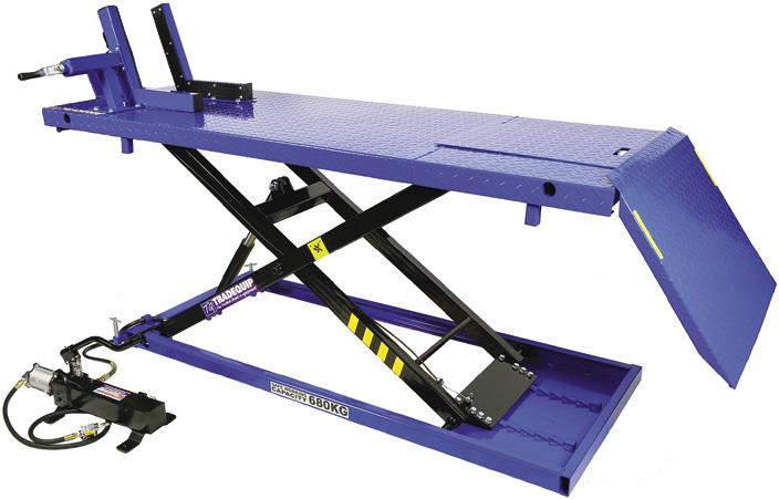 MOTORCYCLE LIFTERS *Additional Freight Rates may apply 31 Established 1984 – “trusted by Australia’s trade for more than 40 years’’ Safe working capacity: 450kg Height: 175 - 750mm Platform: 680W x 2200Lmm Weight: 120kg MADE FOR THE TRADE MOTORCYCLE LIFTER 450KG 2101T Safe working capacity: 680kg Height: 185 - 825mm Platform dimensions: 710 x 2000mm Required air pressure: 0.75-0.85Mpa Weight: 169kg Side Extensions 2103T-EXT MADE FOR THE TRADE MOTORCYCLE LIFTER AIR ACTUATED 680KG 2103T Safe working capacity: 500kg Height: 95 - 420mm Platform dimensions: 450x150mm Weight: 13.8kg Safe working capacity: 360kg Height: 205 - 780mm Platform: 490W x 1345Lmm Weight: 95kg Features wide lifting stability MADE FOR THE TRADE MADE FOR THE TRADE MOTORCYCLE SCISSOR LIFT 500KG 2104T MOTORCYCLE LIFTER 360KG 2102T the trusted brand in equipment the trusted brand in equipment the trusted brand in equipment the trusted brand in equipment FEATURES Ideal lift for use with motorcycles, ATV’s, tractors, personal watercraft & snowmobiles. Locking bar for safety. Powder coated structural heavy duty steel. Extra Long Full width loading ramp. Step-less rate of lowering irrespective of load. Oil trap plate for easy drainage. 2 foot pedals for raising & lowering - for easy hands free operation. Fitted with 2 position platform locking device to prevent accidental lowering. Quality wheels and swivel castors making it easier to position and move around. Lockdown bolts to prevent unwanted movement during use. Does not include tie down straps. FEATURES Designed to deliver the ideal lift for use with motorcycles, ATV’s, tractors, personal watercraft, and snowmobiles. Locking bar for safety. Extra long full width loading ramp. Powdercoated structural heavy duty steel. Stepless rate of lowering irrespective of the load. Oil trap plate for easy drainage. Lockdown bolts. 2 foot pedals for raising & lowering - for easy hands free operation. Fitted with 2 position platform locking device. FEATURES Designed to deliver the ideal lift for use with motorcycles, ATV’s, tractors, personal watercraft, and snowmobiles. Lifts back wheel off lift table for tyre/wheel change . Powder coated structural heavy duty steel construction. Rotate lead screw to adjust & raise the lift. Bolt down lugs to prevent unwanted movement. 450kg Capacity 680kg Capacity 360kg Capacity 500kg Capacity $1189 Excludes GST Inc. GST $1307.90 $2099 Excludes GST Inc. GST $2308.90 $929 Excludes GST Inc. GST $1021.90 $165 Excludes GST Inc. GST $181.50