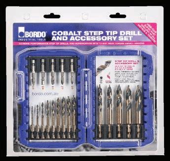 Bordo Cobalt Step Tip drills deliver super-fast drilling in metals and timber. Impact rated, they are suitable for use in cordless drills and impact drivers. Includes Phillips #1, Phillips #2, Phillips #3, Slotted 6mm and Hex 5mm impact rated power bits.