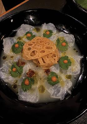Paper-thin, nearly translucent snapper sashimi floats in bright yuzu juice, delicately topped with cilantro and dry miso. You scoop the fish onto a crispy lotus chip and, for a brief moment, transcend. Soft and crisp, sour and sweet, a multilayered umami that makes you wish the plate would never end.