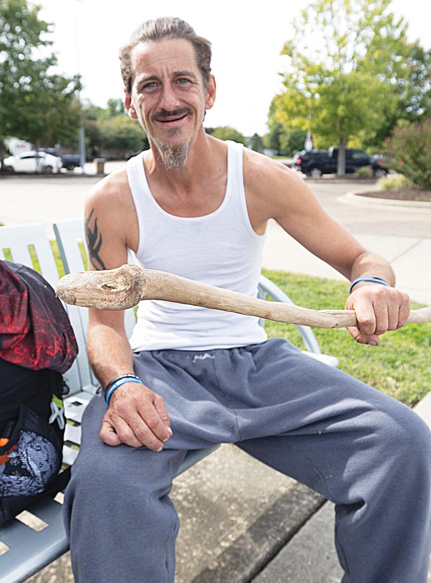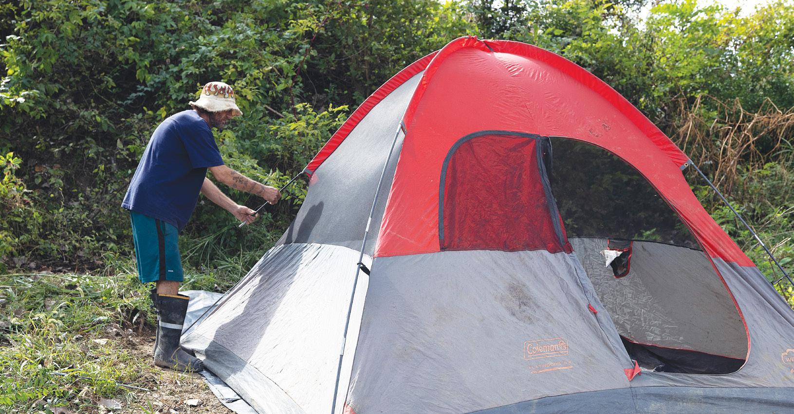 Radar, a homeless individual who said he's resided in the wooded area known as Tent City for 8 years, stands in front of his shelter. | Photo by Ryan Richardson.