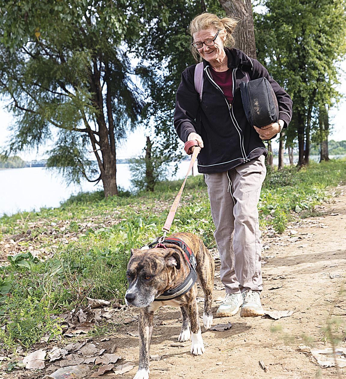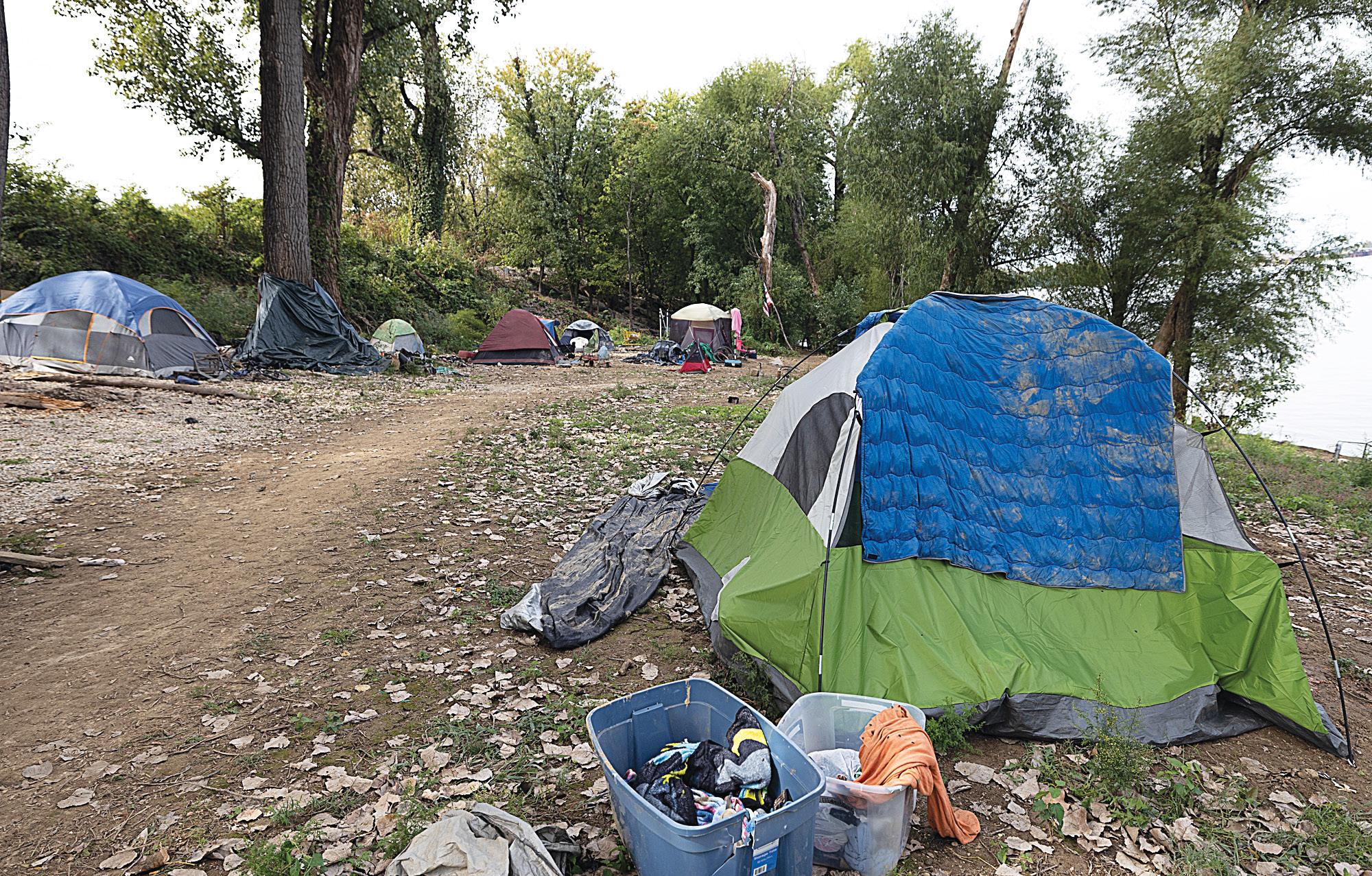 On a bright fall afternoon, one person tightened the guy lines on a sagging shelter. Two men cast fishing lines into the river. A woman knelt with thread and stones, turning bits of river rock into handmade jewelry. A few people slept. Others talked in the open, dogs curled at their feet.