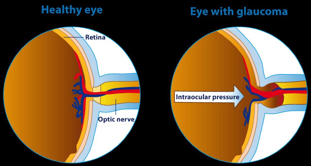 Apictureofahealthyeyeisshownnexttoapictureofaglaucomatouseye.