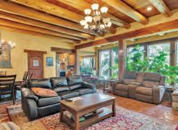 The great room features high ceilings, north and south-facing portals, clerestory windows, and Aspen tongue-and-groove high walls and ceiling, offering woodsy warmth above the earthen plastered walls. The built-in stereo system with nine speakers, including two subwoofers, and a large recessed TV will remain with the home. Outdoor living is enhanced by large porches on both the north and south sides, perfect for entertaining and enjoying unobstructed views of Pueblo Peak.
