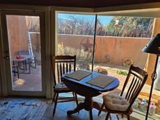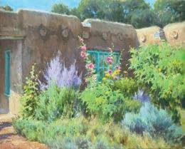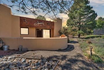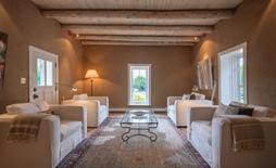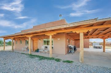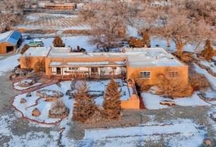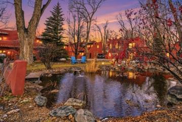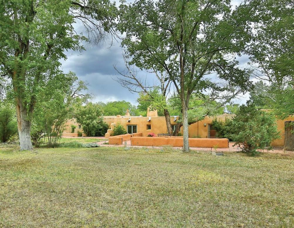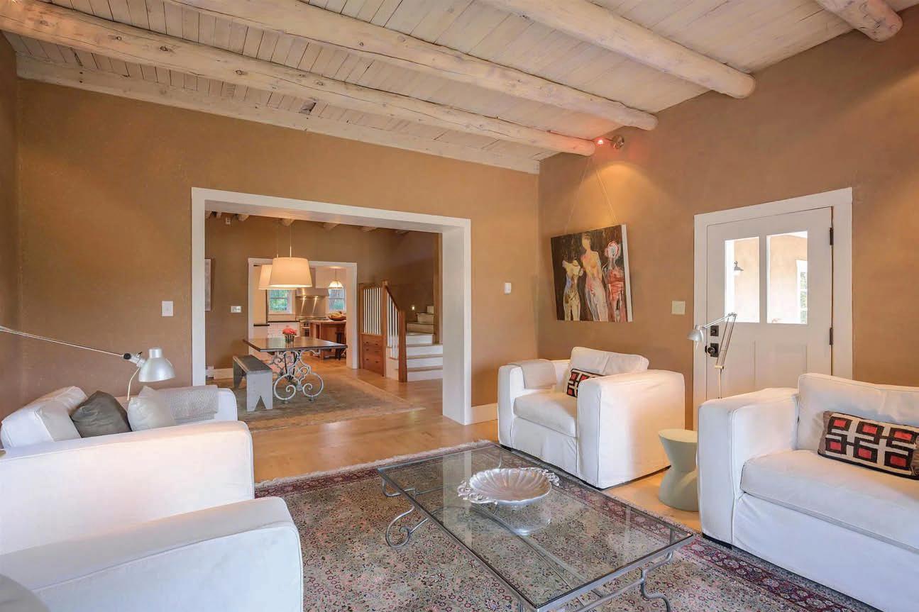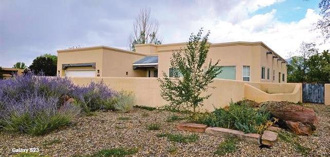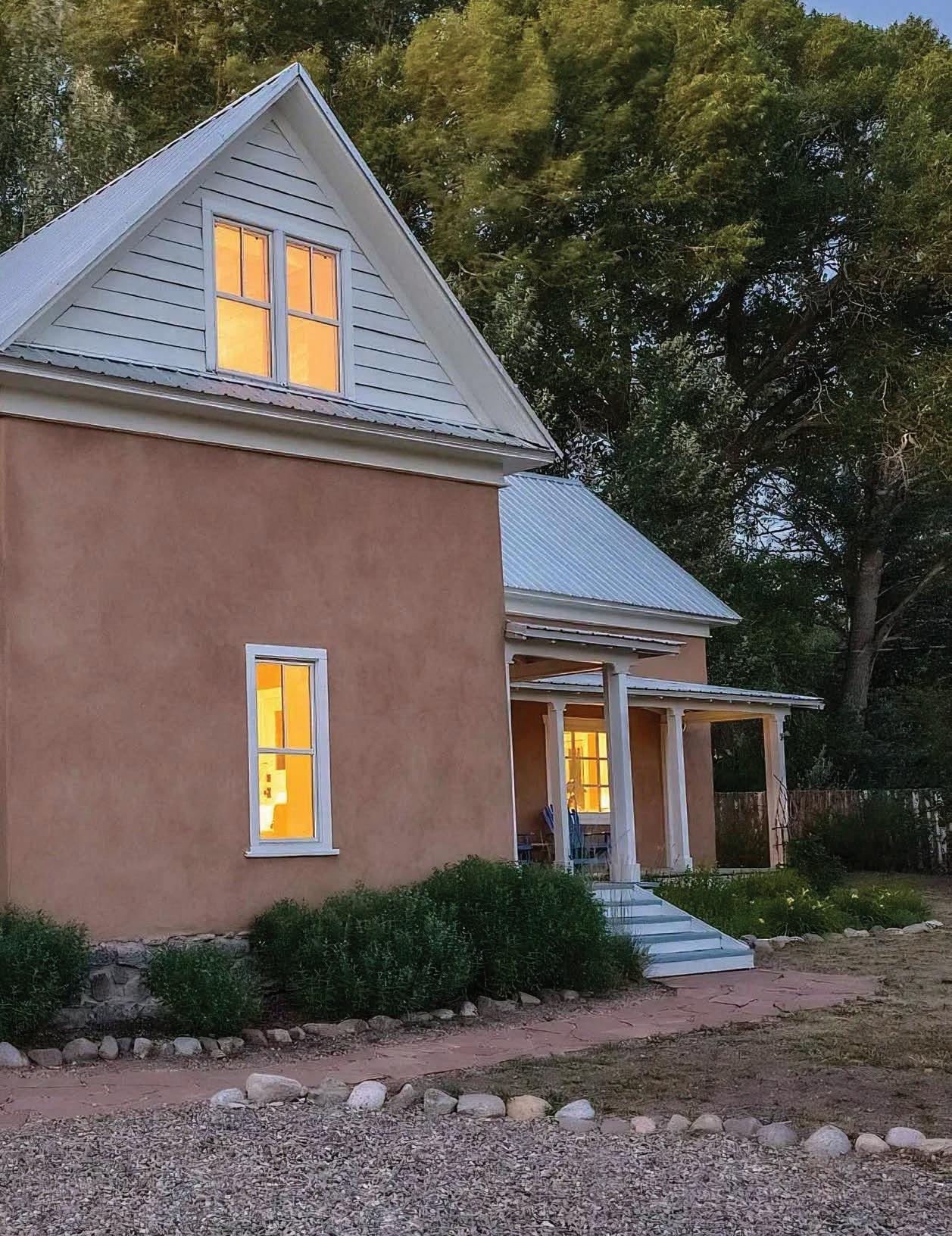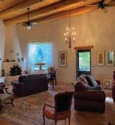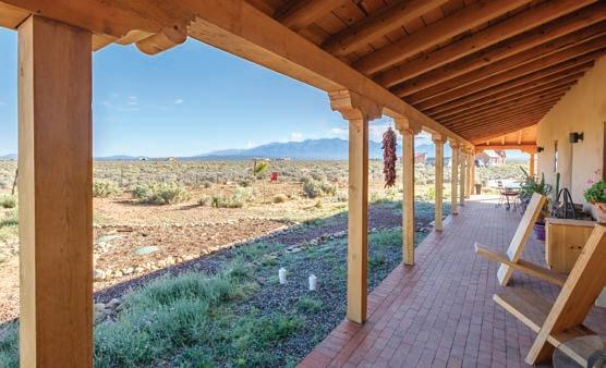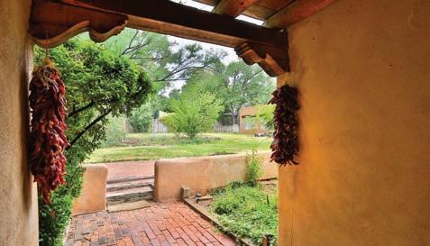 The house has welcoming porches on the front and side that overlook the expansive yard which is irrigated by an acequia called the Plaza Ditch. As spring begins, vibrant flowers bloom next to the porches. Flagstone connects the house to the outdoors and forms bridges that cross the acequia.