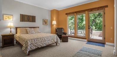 Upstairs the primary suite has a sitting area, cedar lined closet and views through the south facing windows. Its bathroom has travertine tile and a soaking tub under a window that can be opened to catch spring breezes.