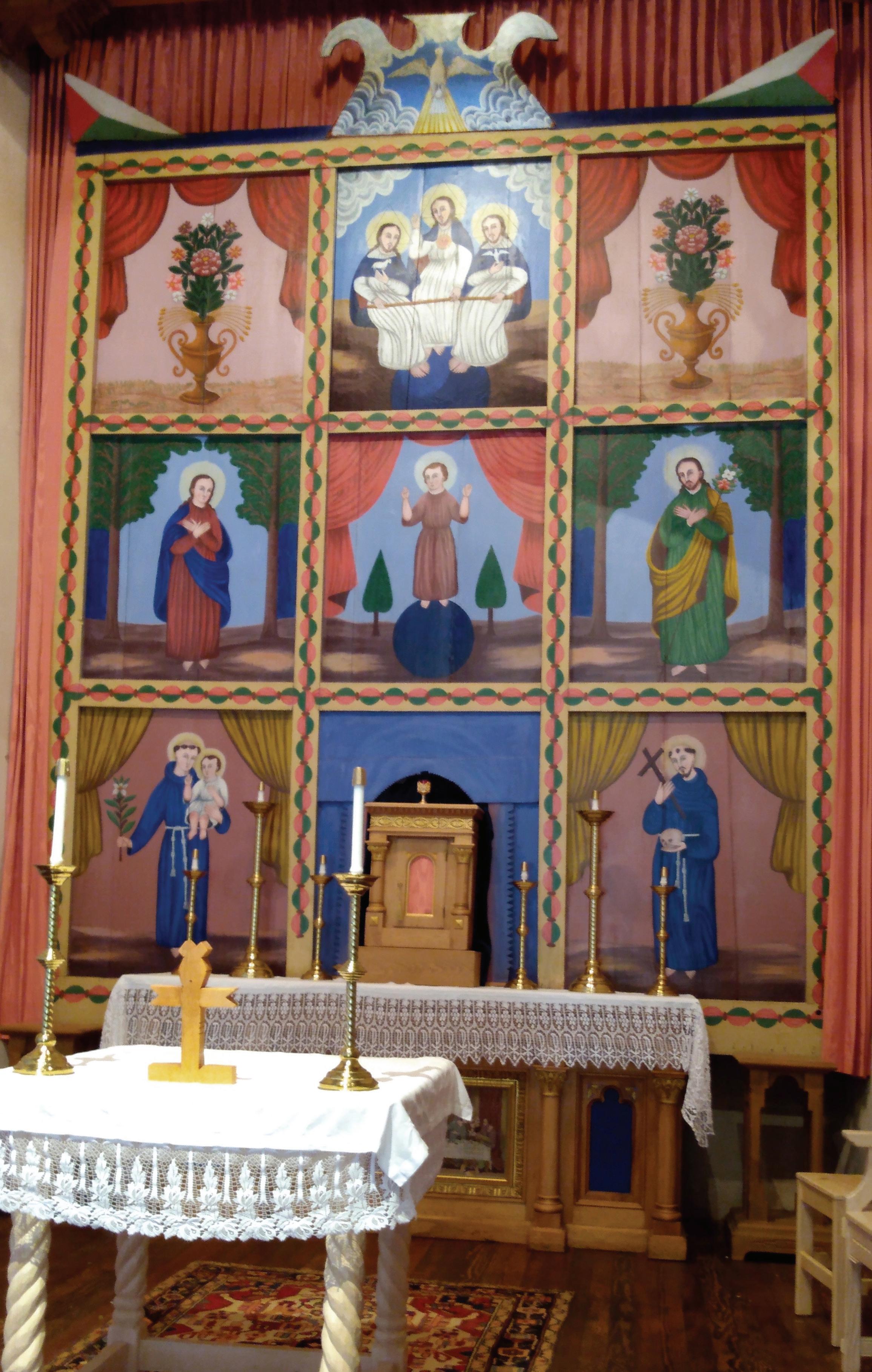 The altar screen was painted by José de García in 1861 on the altar space itself, as it was too big to bring in through the doors. Top center is the Holy Trinity, tied together as one. Below this is the child Jesus, preaching to all the world.