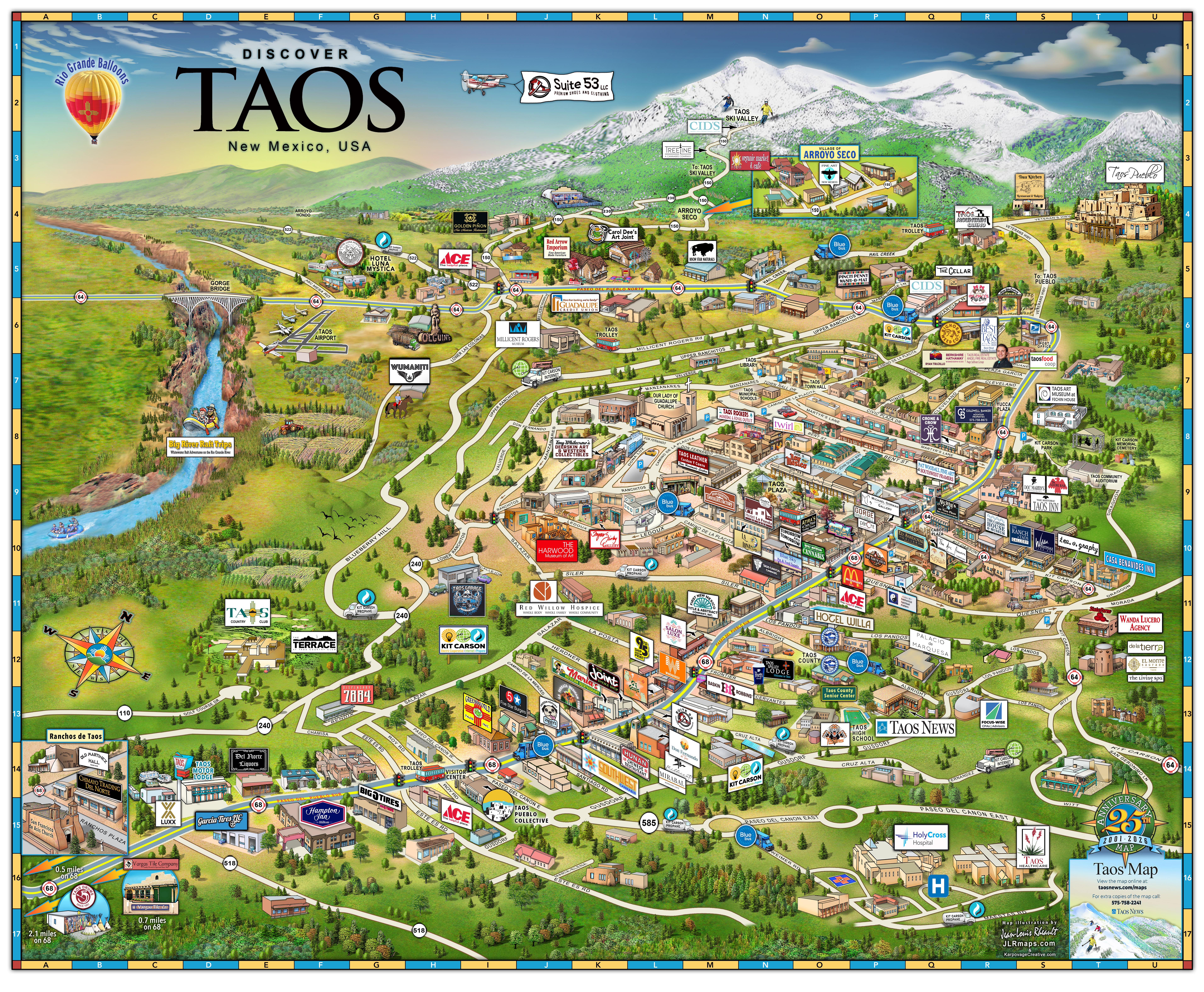 Experience Taos and the Enchanted Circle like never before with our unique hand-drawn maps. These guides offer an easy way to navigate the area's top attractions and hidden gems.