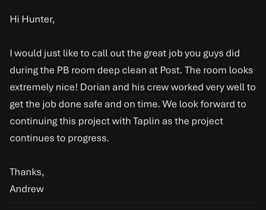 Shout out to Dorian Reed (IS) and his crew—Ontayveon, Eriberto, Andrew, Ontarion, Melvin, and Sam! We received great feedback on your deep clean at Post. The room looks extremely nice, & you performed the task in a safe and timely manner. Thanks Dorian & crew, way to embody what Taplin TEAMWORK is all about!