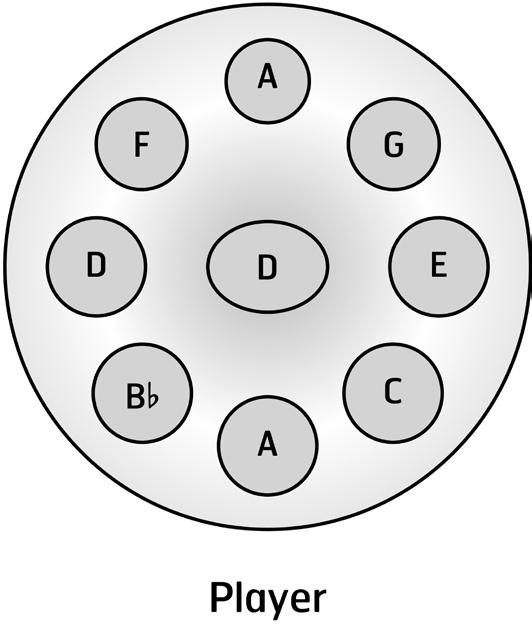 Note collection (lowest to highest): D (low/center)/-A-Bb-C-D-E-F-G-A (Sounding pitch is one octave lower than written in the score.)