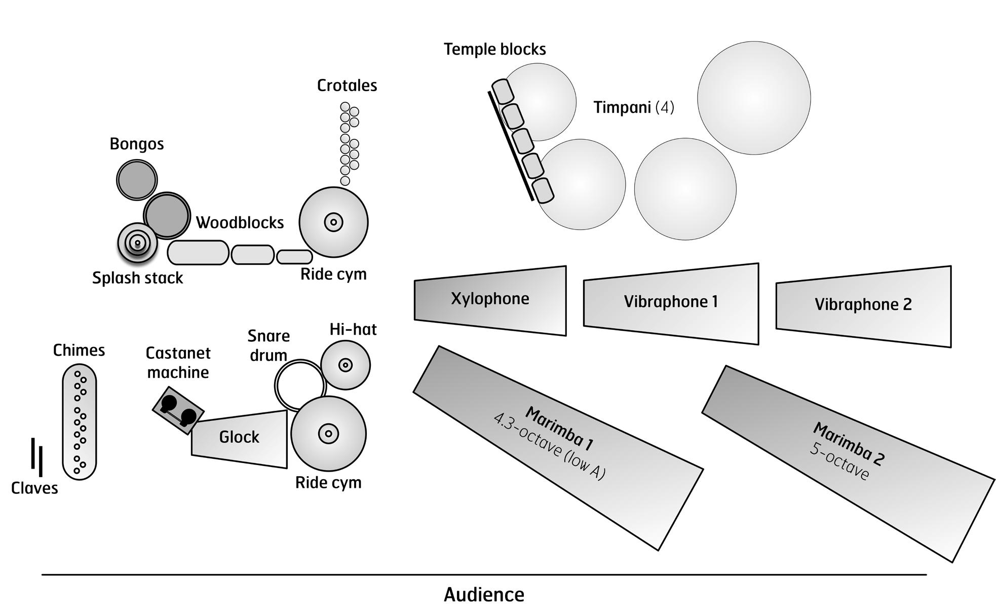 9. Percussion — 3 woodblocks, splash stack, ride cymbal, bongos, crotales (high octave—may sub low octave if necessary)