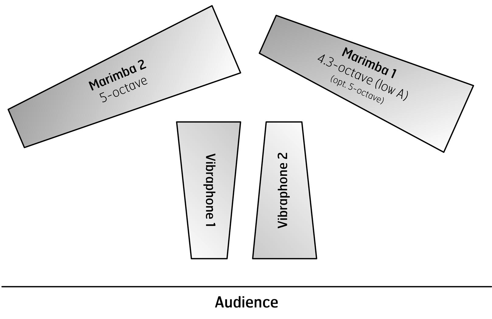 Marimba 1 may be played on a low A marimba by taking a few measures up an octave (as notated in the score and part). Play as written if on a 5-octave marimba.