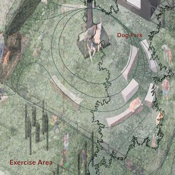 The dog park is a public area where all dog owners can come to play or relax while their dogs run around freely on the hilly terrain. A good way to meet fellow dog lovers. The exercise area is as well public and an important element as physical health is closely interconnected with mental health.