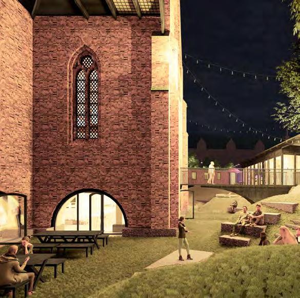The new tower houses several wheelchair friendly co-living apartments with a shared kitchen, dining and living room. On the third floor, connected to the attic of the church by a skybridge, the atelier is placed and gives the aspiring artists an inspiring view while being closely connected to other functions for exploration of their surroundings.